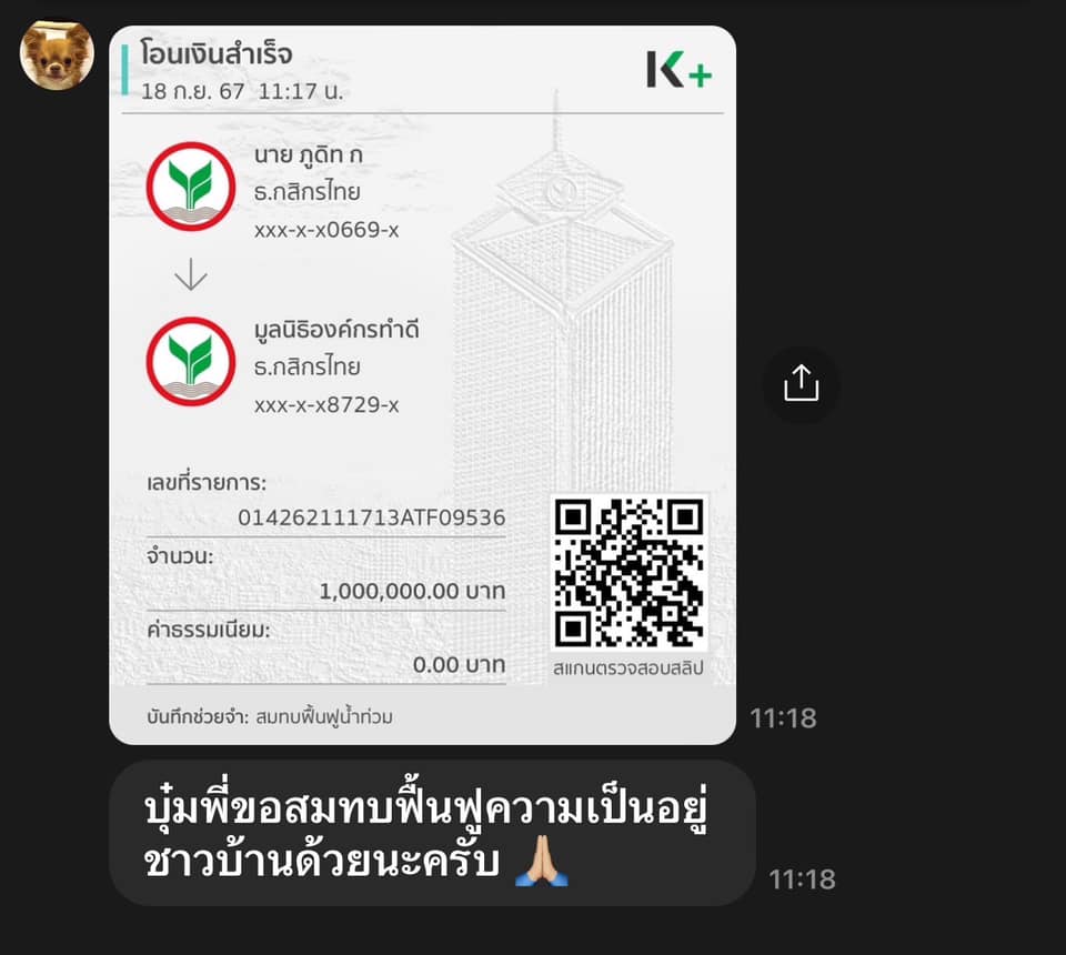 “พี่หนุ่ม กรรชัย ทักหาบุ๋ม ฝากเงินมาช่วยฟื้นฟูความเดือดร้อนของชาวบ้าน 1,000,000 บาท สุดยอดเลยค่ะพี่หนุ่ม น้ำตาจะไหล ขอบคุณแทนประชาชนที่เดือดร้อนด้วยนะคะ แกไม่ชอบให้อวยหรอก ชอบทำเงียบๆ แต่บุ๋มอยากให้ทุกคนได้รับรู้ ว่าแกใจดีมากแค่ไหน พวกเรารักพี่หนุ่มค่ะ ”