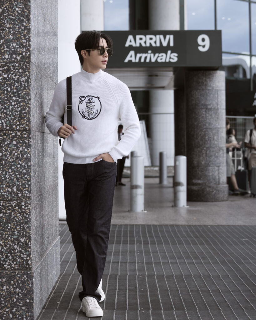 ด้านหนุ่ม “ซี พฤกษ์” มาในลุคเสื้อสเวตเตอร์คอตั้งสีขาวพร้อมลายปักรูปสมอและโลโก้ Emporio Armani กางเกงเดนิมสีกรมท่า รองเท้าผ้าใบสีขาว คอมพลีตลุคด้วยกระเป๋า Belt Bags รุ่น ASV regenerated Saffiano leather ขนาดกะทัดรัดประดับด้วยฮาร์ดแวร์โลโก้เจ้านกอินทรีย์แห่ง Emporio Armani
