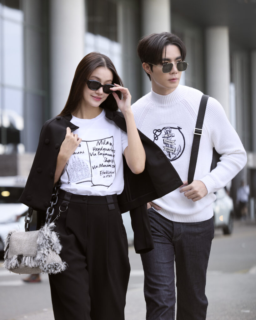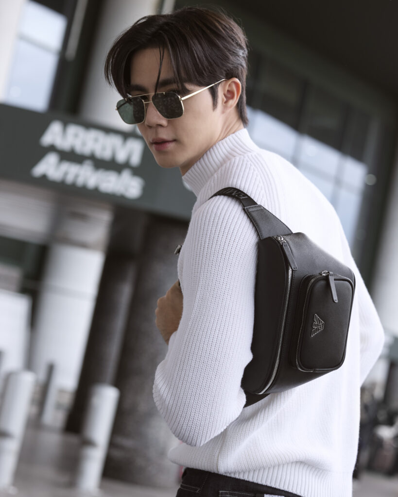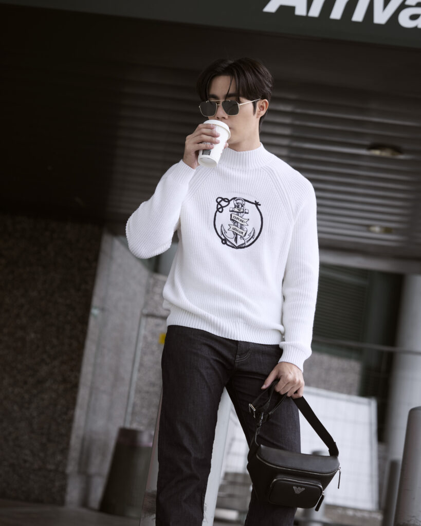 ด้านหนุ่ม “ซี พฤกษ์” มาในลุคเสื้อสเวตเตอร์คอตั้งสีขาวพร้อมลายปักรูปสมอและโลโก้ Emporio Armani กางเกงเดนิมสีกรมท่า รองเท้าผ้าใบสีขาว คอมพลีตลุคด้วยกระเป๋า Belt Bags รุ่น ASV regenerated Saffiano leather ขนาดกะทัดรัดประดับด้วยฮาร์ดแวร์โลโก้เจ้านกอินทรีย์แห่ง Emporio Armani