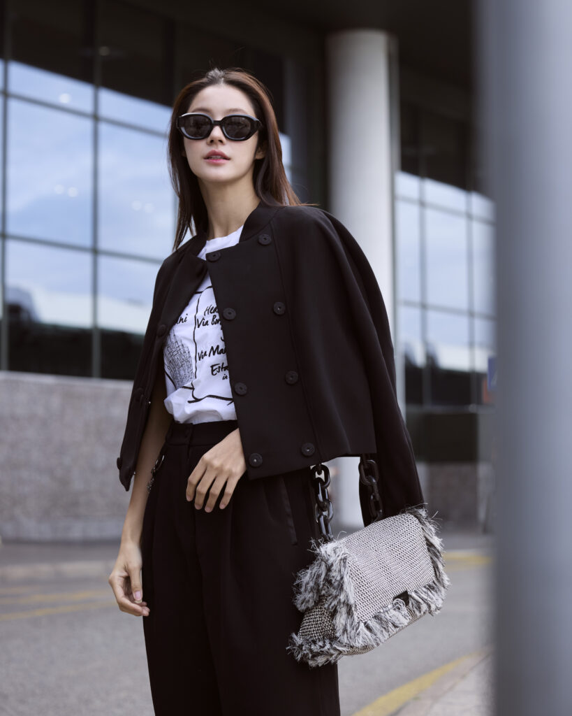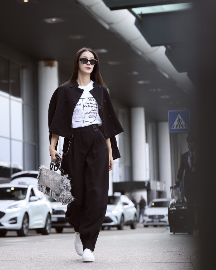 นางเอกสาว “น้ำตาล ทิพนารี” มาในลุคคลาสสิกสุดหรูแฝงความเท่สไตล์สาว Emporio Armani ด้วยการแมตช์ ไอเทมเบสิกอย่าง T-shirt กับ กางเกงสแลคทรงกระบอก เพิ่มลูกเล่นปลายขาด้วยการประดับกระดุม สวมทับด้วย เบลเซอร์ดีไซน์โก้ ทรงโอเวอร์ไซส์ ให้ความอบอุ่นรับปลายทางมิลานที่อากาศกำลังเย็นสบายของฤดูใบไม้ร่วง และกระเป๋ารุ่น Fringed straw shoulder bag ทรงสี่เหลี่ยมทำจากฟางถักประดับพู่สีขาว-ดำ มาพร้อมสายโซ่สุดเก๋