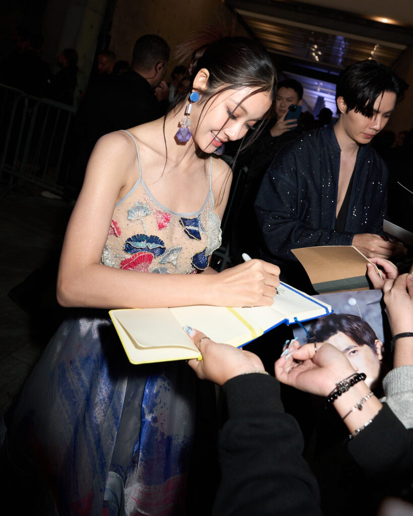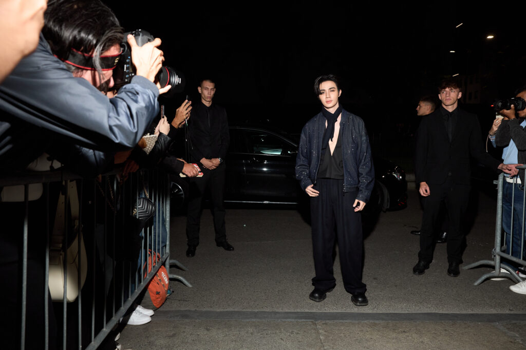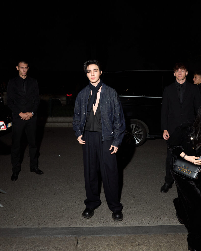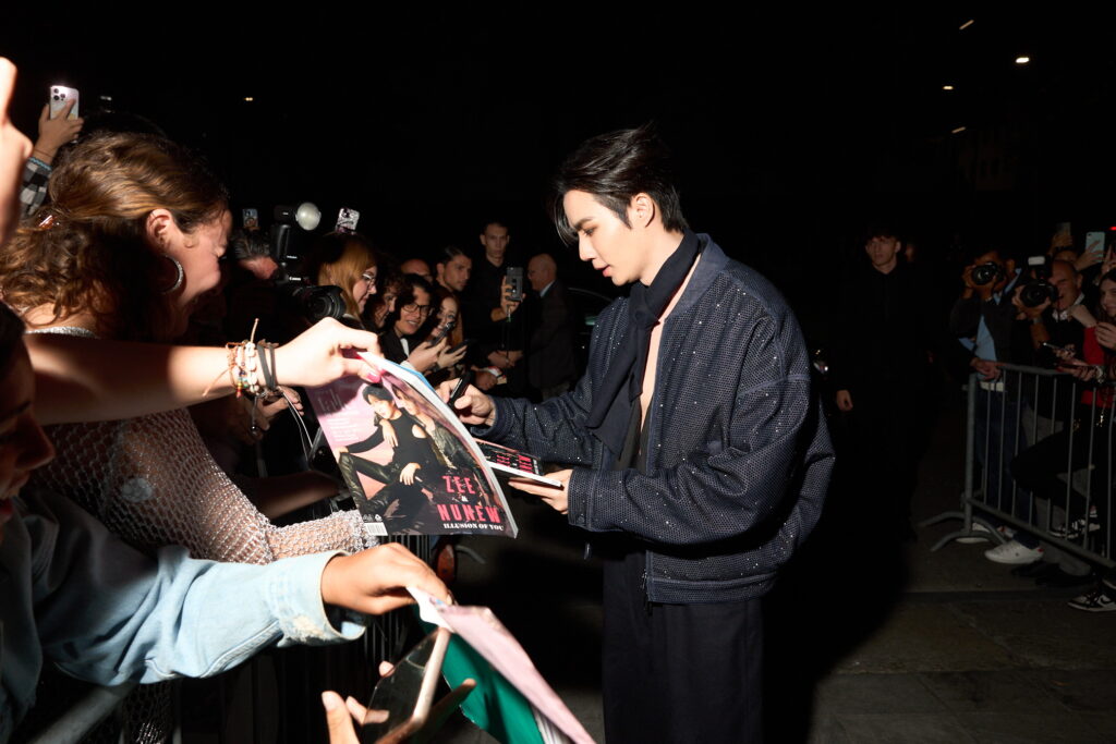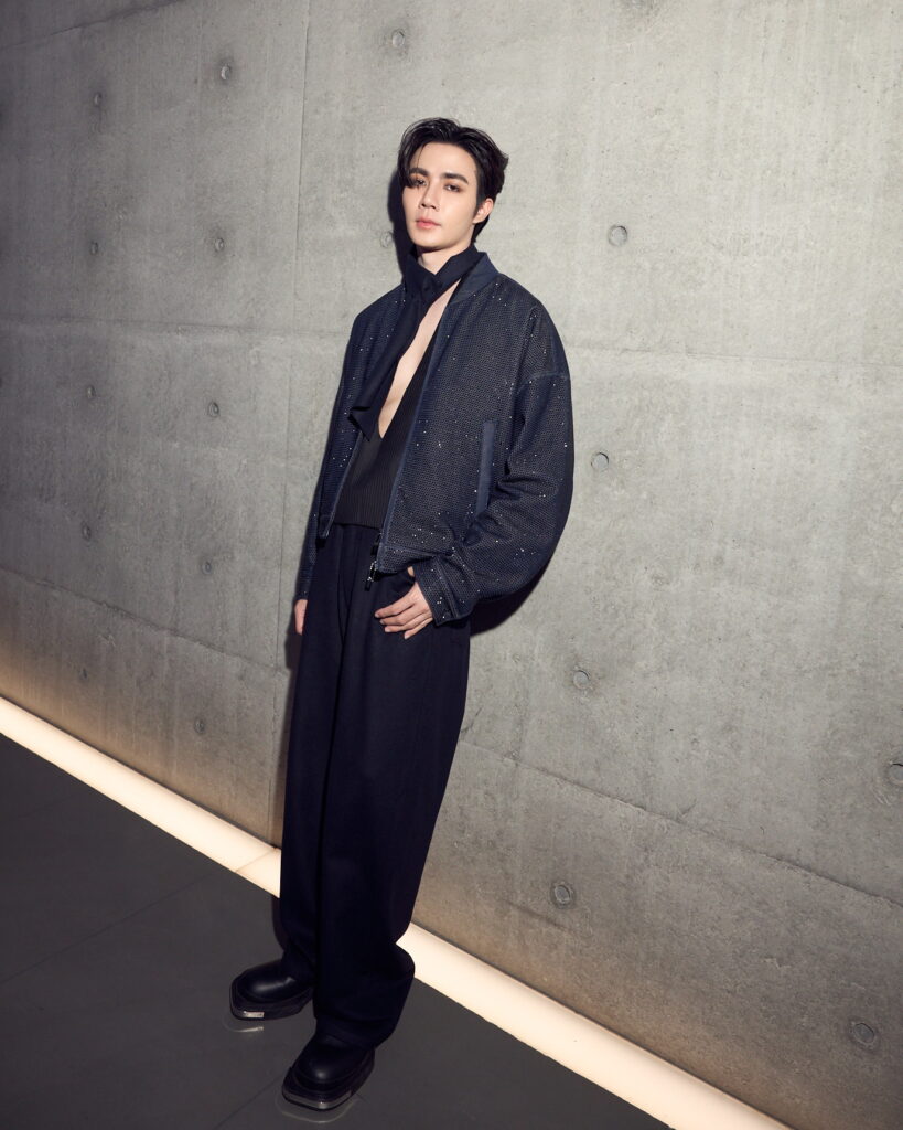 ด้านนักแสดงหนุ่มซีรีย์วายสุดฮอตซีพฤกษ์เข้าร่วมชมโชว์ในชุดแจ็กเก็ตทรงสั้นสีกรมท่า แมตช์กับกางเกงทรงหลวมสบาย เพิ่มลูกเล่นด้วยเสื้อกั๊กคอวีสีดำให้ลุคที่เรียบหรูเซ็กซี่ จาก Emporio Armani คอลเลกชัน Fall/Winter 2024เช่นเดียวกัน เผยว่า ตื่นตาตื่นใจกับคอนเลกชันนี้มาก เพราะส่วนตัวชอบสูทสีดำ และ เอิร์ธโทน แต่ครั้งนี้มีชุดสูทที่หลากหลายสีสัน ให้ความรู้สึกสนุกกับการแต่งตัว
