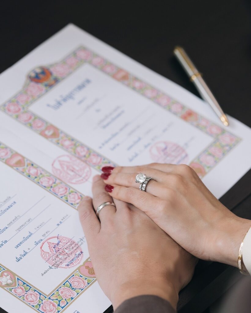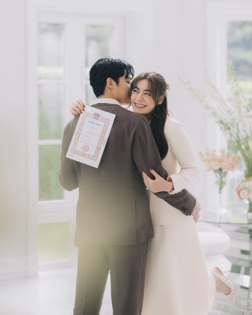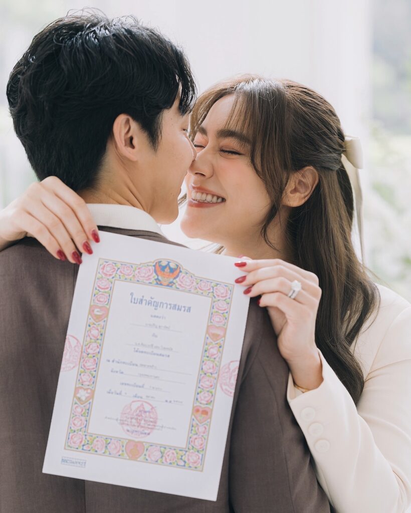 ล่าสุดทั้งคู่ก็ถือฤกษ์ดีในเดือนตุลาคม เกี่ยวก้อยกันจดทะเบียนสมรสอย่างเป็นทางการ เริ่มต้นการเป็นสามี ภรรยา อย่างถูกต้องตามกฏหมายแล้ว ท่ามกลางความยินดีของครอบครัวของทั้งคู่