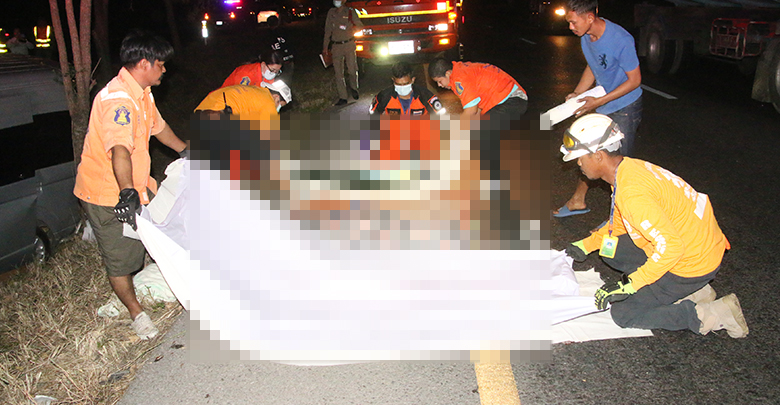พบรถตู้โตโยต้า สีเทา ทะเบียน นข 2041 ชุมพร ตกอยู่ในร่องกลางถนน สภาพด้านหน้าชนอัดติดกับต้นไม้ ข้างรถพบร่างคนเจ็บออกมานอนอยู่ 4 ราย ส่วนคนขับ ทราบชื่อต่อมานายเจริญ มากช่วย อายุ 50 ปี ชาวตำบลไสไทย อ.เมืองกระบี่ โดนอัดติดคาพวงมาลัย ได้รับบาดเจ็บที่ขาทั้งสองข้าง ส่วนในรถยังพบเด็กชายอายุ ประมาณ 6 ปี ถูกเก้าอี้นั่งทับขาอยู่ โดยมีเด็กผู้หญิงวัยใกล้เคียงกันเสียชีวิตอยู่ข้างๆ ที่เบาะหน้าพบร่างหญิงวัยกลางคนเสียชีวิตคาเบาะเช่นเดียวกัน ส่วนที่เบาะด้านหลังยังพบร่างหญิงวัย ประมาณ 35-40 ปี ได้รับบาดเจ็บติดอยู่กับเบาะ ซึ่งทุกราย ที่อยู่ในรถ ทางกู้ภัยต้องใช้เครื่องตัดถ่างช่วยงัดซากรถเพื่อนำร่างคนเจ็บและคนเสียชีวิตออกมา และเมื่องัดเอาเก้าอี้นั่งในรถออกมาจนหมดก็ยังพบร่างเด็กหญิงวัยประมาณ 2 ขวบ นอนเสียชีวิตอยู่กับพื้นด้านหลังเบาะที่นั่งคนขับอีก 1 ราย ทางเจ้าหน้าที่กู้ภัยและกู้ชีพ ทำการลำเลียงผู้บาดและเสียชีวิต นำส่งโรงพยาบาลกุยบุรี โดยพบว่า ผู้ที่โดยสารมาในรถตู้ทั้งหมด 10 คน เป็นชาย 6 หญิง 4 คน เสียชีวิตเป็นเพศหญิงทั้งหมด 3 ราย จากการสอบถามนายสายัณ ตั่นเร่ง อายุ 45 ปี เจ้าของที่นั่งรถมาด้วยเล่าว่า ตนเองพร้อมกับญาติๆกำลังจะเดินทางไปร่วมงานแข่งนกที่จังหวัดนครนายก และถือโอกาสไปเที่ยวด้วย ตนขับรถมาจาก อ.ละแม เมื่อมาถึงตัวเมืองชุมพร ก็ได้เปลี่ยนให้นายเจริญขับ ในขณะเกิดเหตุ ตนหลับอยู่จึงไม่ทราบว่าเกิดอะไรขึ้นแต่คาดว่าคนขับน่าจะวูบหลับไป ทำให้เกิดอุบัติเหตุน่าสลดขึ้นดังกล่าว เจ้าหน้าที่ตำรวจจะได้ทำการสอบสวนข้อเท็จจริงต่อไป