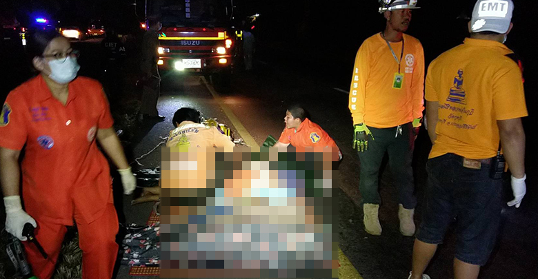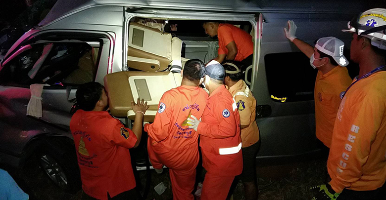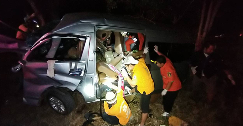 พบรถตู้โตโยต้า สีเทา ทะเบียน นข 2041 ชุมพร ตกอยู่ในร่องกลางถนน สภาพด้านหน้าชนอัดติดกับต้นไม้ ข้างรถพบร่างคนเจ็บออกมานอนอยู่ 4 ราย ส่วนคนขับ ทราบชื่อต่อมานายเจริญ มากช่วย อายุ 50 ปี ชาวตำบลไสไทย อ.เมืองกระบี่ โดนอัดติดคาพวงมาลัย ได้รับบาดเจ็บที่ขาทั้งสองข้าง ส่วนในรถยังพบเด็กชายอายุ ประมาณ 6 ปี ถูกเก้าอี้นั่งทับขาอยู่ โดยมีเด็กผู้หญิงวัยใกล้เคียงกันเสียชีวิตอยู่ข้างๆ ที่เบาะหน้าพบร่างหญิงวัยกลางคนเสียชีวิตคาเบาะเช่นเดียวกัน ส่วนที่เบาะด้านหลังยังพบร่างหญิงวัย ประมาณ 35-40 ปี ได้รับบาดเจ็บติดอยู่กับเบาะ ซึ่งทุกราย ที่อยู่ในรถ ทางกู้ภัยต้องใช้เครื่องตัดถ่างช่วยงัดซากรถเพื่อนำร่างคนเจ็บและคนเสียชีวิตออกมา และเมื่องัดเอาเก้าอี้นั่งในรถออกมาจนหมดก็ยังพบร่างเด็กหญิงวัยประมาณ 2 ขวบ นอนเสียชีวิตอยู่กับพื้นด้านหลังเบาะที่นั่งคนขับอีก 1 ราย ทางเจ้าหน้าที่กู้ภัยและกู้ชีพ ทำการลำเลียงผู้บาดและเสียชีวิต นำส่งโรงพยาบาลกุยบุรี โดยพบว่า ผู้ที่โดยสารมาในรถตู้ทั้งหมด 10 คน เป็นชาย 6 หญิง 4 คน เสียชีวิตเป็นเพศหญิงทั้งหมด 3 ราย จากการสอบถามนายสายัณ ตั่นเร่ง อายุ 45 ปี เจ้าของที่นั่งรถมาด้วยเล่าว่า ตนเองพร้อมกับญาติๆกำลังจะเดินทางไปร่วมงานแข่งนกที่จังหวัดนครนายก และถือโอกาสไปเที่ยวด้วย ตนขับรถมาจาก อ.ละแม เมื่อมาถึงตัวเมืองชุมพร ก็ได้เปลี่ยนให้นายเจริญขับ ในขณะเกิดเหตุ ตนหลับอยู่จึงไม่ทราบว่าเกิดอะไรขึ้นแต่คาดว่าคนขับน่าจะวูบหลับไป ทำให้เกิดอุบัติเหตุน่าสลดขึ้นดังกล่าว เจ้าหน้าที่ตำรวจจะได้ทำการสอบสวนข้อเท็จจริงต่อไป