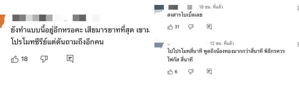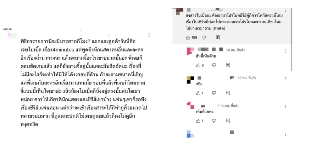 แต่มีบางช่วงที่พิธีกรได้ถามหนุ่ม “เจษ” ถึงความสัมพันธ์ที่สนิทสนิมกับสาว “ใบเฟิร์น พิมพ์ชนก” จนแฟนๆจับจิ้นและลุ้นให้เป็นคู่จริง ขณะเดียวกันทางด้าน “ไบเบิ้ล” ก็นั่งนิ่ง ท่ามกลางชาวเน็ตเข้ามาคอมเมนต์สงสาร “ไบเบิ้ล” และมองว่าเป็นการไม่ให้เกียรติ เพระทั้งคู่มาโปรโมทซีรีส์คู่กัน แต่ดันไปถามอีกเรื่องเสียมารยาทมาก