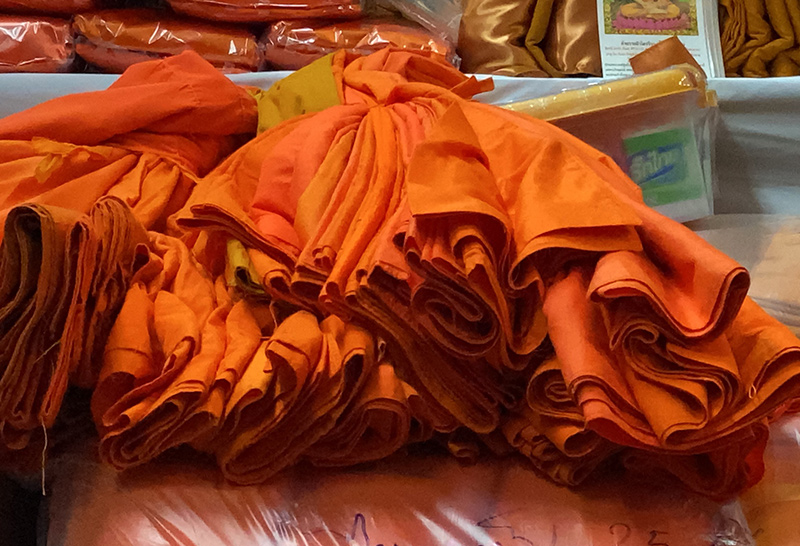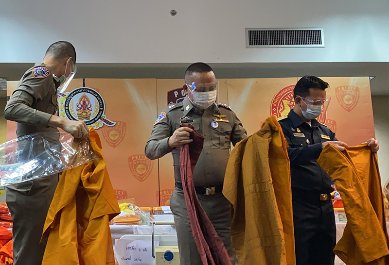 จากการตรวจค้นทั้ง 3 ร้าน พบผ้าไตรจีวร ที่มีสภาพเก่า สีต่างกัน และชุดสังฆทาน ที่เต็มไปด้วยสินค้าที่ไม่มีคุณภาพ จึงยึดของกลางรวมหลายร้อยรายการ เช่น ชุดผ้าไตรจีวร จำนวนกว่า 500 ผืน และชุดสังฆทาน 30 ชุด พร้อมกับเตารีดที่ร้านใช้สำหรับรีดผ้าจีวรมาตรวจสอบ