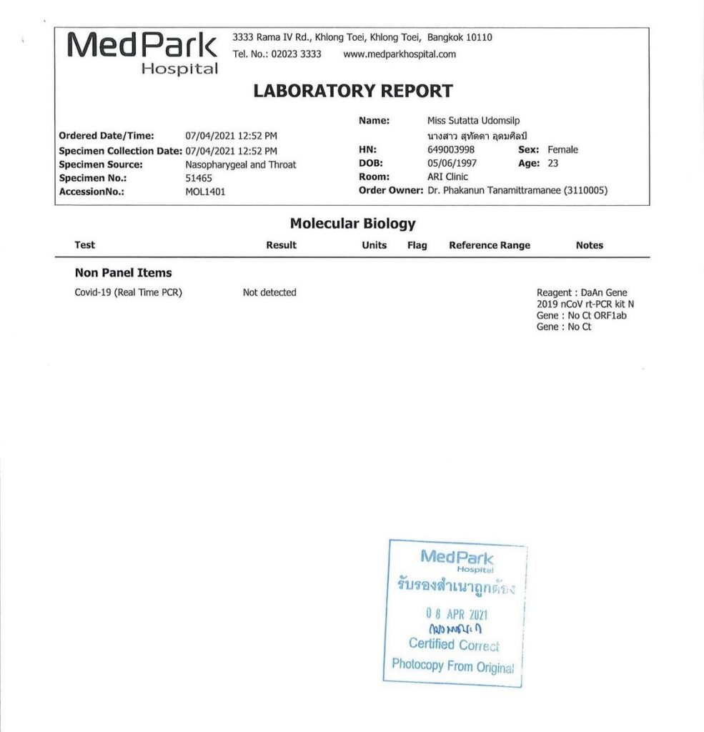 ตอนนี้ผลตรวจหาเชื้อออกมาเรียบร้อยแล้ว *เป็นลบ NOT DETECTED (ไม่พบเชื้อ COVID) นะคะ และเพื่อแสดงความรับผิดชอบต่อสังคม และร่วมมือกับมาตรการของภาครัฐ ปันจะกักตัวเป็นเวลา 14 วัน ให้ครบตามกำหนดอย่างเคร่งครัด