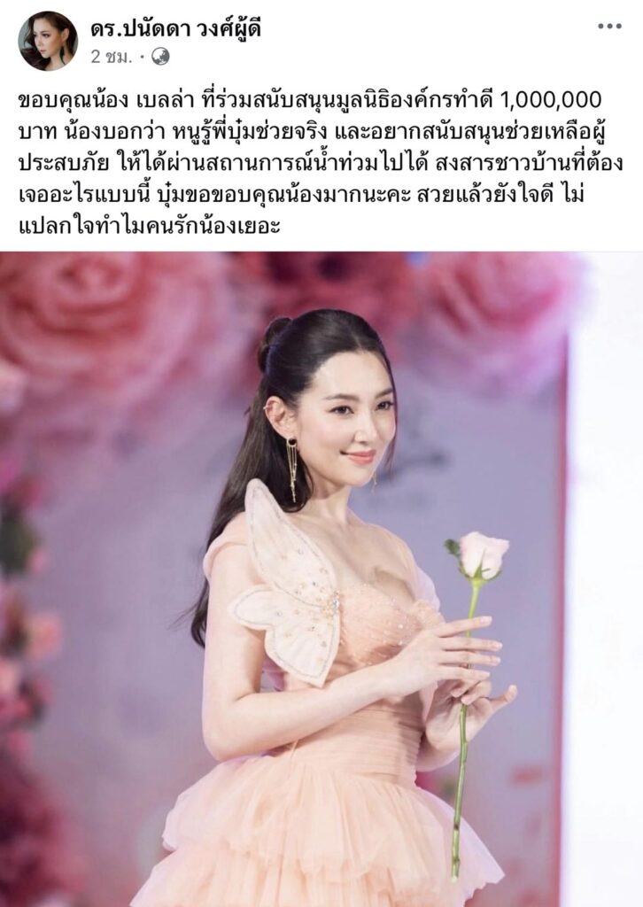 ล่าสุดเรียกว่าคนไทยไม่ทิ้งกัน เมื่อทางด้าน “บุ๋ม ปนัดดา”ได้ออกมาโพสต์ขอบคุณสาว “เบลล่า”ที่ออกมาบริจาคร่วมสนับสนุนมูลนิธิองค์กรทำดี 1,000,000 บาท เพื่อช่วยเหลือผู้ประสบภัยน้ำท่วม พร้อมแคปชั่นว่า “ขอบคุณน้อง เบลล่า ที่ร่วมสนับสนุนมูลนิธิองค์กรทำดี 1,000,000 บาท น้องบอกว่า หนูรู้พี่บุ๋มช่วยจริง และอยากสนับสนุนช่วยเหลือผู้ประสบภัย ให้ได้ผ่านสถานการณ์น้ำท่วมไปได้ สงสารชาวบ้านที่ต้องเจออะไรแบบนี้ บุ๋มขอขอบคุณน้องมากนะคะ สวยแล้วยังใจดี ไม่แปลกใจทำไมคนรักน้องเยอะ” ท่ามกลางชาวเน็ตเข้ามาคอมเมนต์อนุโมทนาบุญสาธุเป็นจำนวนมาก