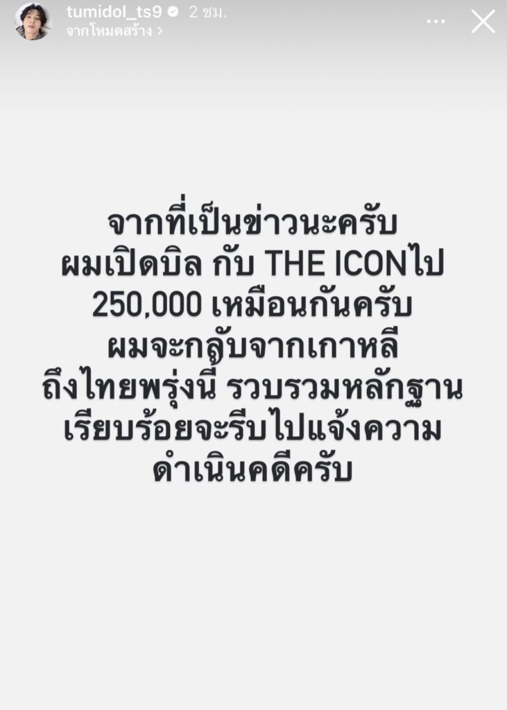 ล่าสุด “ตั้ม เดอะสตาร์” ได้ออกมาเคลื่อนไหวถึงประเด็นดังกล่าว พร้อมเขียนแคปชั่นว่า“จากที่เป็นข่าวนะครับ ผมเปิดบิลกับ THE ICON ไป 250,000 บาท เหมือนกันครับ ผมจะกลับจากเกาหลีถึงไทยพรุ่งนี้ รวบรวมหลักฐานเรียบร้อยจะรีบไปแจ้งความดำเนินคดีครับ”