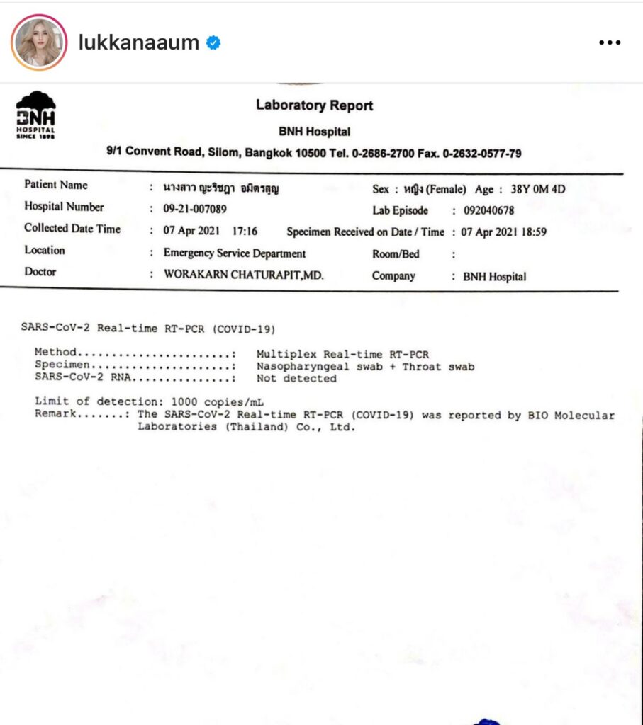 “ผลตรวจCovid รอบแรกอุ้ม น้องดิส พี่บอล น้องกาตูน Not Detected นะคะ โล่งใจไปเปราะนึง แต่เราจะกักตัวและเฝ้าดูอาการต่อไปอีก14วัน และตั้งใจจะตรวจรอบ2ด้วยค่ะ #ขอบคุณทุกๆกำลังใจที่ให้ครอบครัวเรานะคะ #covid19 #แม่รอดแล้ว”