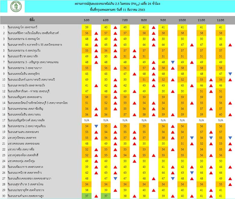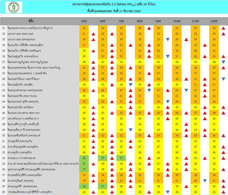 ศูนย์ประสานงานและแก้ไขปัญหามลพิษทางอากาศของกรุงเทพมหานคร รายงานข้อมูลผลการตรวจวัด PM2.5 ประจำวันที่ 11 ธ.ค. 63 ช่วง เวลา10.00-12.00น. ตรวจวัดค่าได้ 36-67 มคก./ลบ.ม. อยู่ในระดับเริ่มมีผลกระทบต่อสุขภาพ และมีแนวโน้มเพิ่มขึ้นและมีค่าเกินมาตรฐาน จำนวน 36 พื้นที่ โดยพื้นที่ที่ตรวจวัดค่าได้สูงสุดเมื่อเวลา 12.00 น. ได้แก่ ริมถนนเพชรเกษม เขตหนองแขม วัดค่าได้ 67 มคก./ลบ.ม. ส่วนพื้นที่คุณภาพอากาศดี มีเพียง 1พื้นที่ ได้แก่ สวนพระนคร เขตลาดกระบัง วัดค่าได้ 37 มคก./ลบ.ม. ทั้งนี้ สำหรับประชาชนทั่วไปยังสามารถทำกิจกรรมกลางแจ้งได้ตามปกติ ผู้ที่ต้องดูแลสุขภาพเป็นพิเศษ หากมีอาการเบื้องต้น เช่น ไอ หายใจลำบาก ระคายเคืองตา ควรลดระยะเวลาทำกิจกรรมกลางแจ้ง