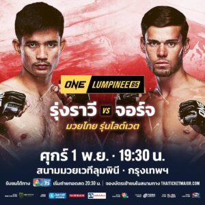 ศึกครั้งนี้เป็นการเจอกันระหว่างนักสู้ไทยมากฝีมือที่มาล่าชัยชนะไฟต์ที่ 6 ปะทะกับ นักสู้จากเกาะอังกฤษ ที่หวังมาปราบนักกีฬา ONE เป็นรายที่ 2 ติดต่อกันให้ได้ ต้องมาดูกันว่า “รุ่งราวี” หรือ “จอร์จ” ใครจะเป็นผู้ชนะในศึกครั้งนี้ ศุกร์ที่ 1 พ.ย. แฟนมวยห้ามพลาด!