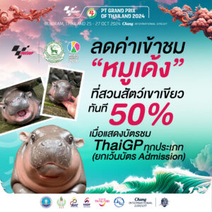 หมูเด้งรันทุกวงการ ล่าสุด“โมโตจีพี” สนามประเทศไทย หรือ ThaiGP สร้างตำนานบทใหม่ จับมือสวนสัตว์เปิดเขาเขียว องค์การสวนสัตว์แห่งประเทศไทย คอลแลบ (Collab) “หมูเด้ง” ซูเปอร์สตาร์ตัวกลม สู่ศึกกรังด์ปรีซ์ที่เร็วและแรงที่สุดในโลก ที่กำลังจะระเบิดศึกบนผืนแผ่นดินไทย จัดแคมเปญเอาใจแฟนความเร็วทั่วโลกที่มีใจรัก ลูกฮิปโปโปเตมัสแคระสุดน่ารัก เจ้าของมีมเกรี้ยวกราดแห่งปี โดยผู้ที่มีบัตรโมโตจีพี เตรียมลุ้นสิทธิ์ 2 เด้ง แบบลิมิเต็ด สนามเดียวในโลก