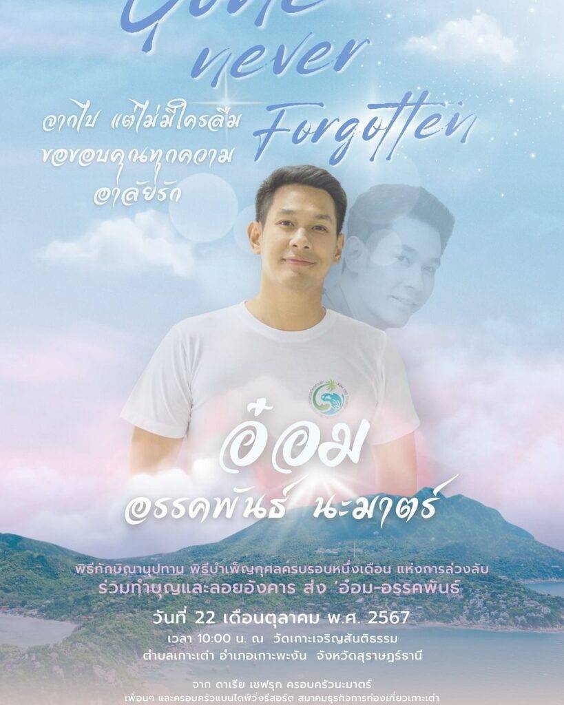 ล่าสุดครบรอบ 1 เดือนของการจากไปของพระเอกผู้ล่วงลับ โดยทางด้วยภรรยา “ดาเรีย เชฟรุก” และครอบครัว พร้อมพี่สนิทนักแสดงสาว “กีตาร์ ศิริพิชญ์“ ได้เดินทางไปทำพิธีทำบุญและลอยอังคาร ที่วัดเกาะเจริญสันติธรรม ต.เกาะเต่า อ.เกาะพะงัน จ.สุราษฏร์ธานี
