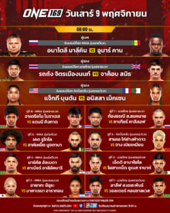 ติดตามรับชมการถ่ายทอดสดศึก ONE 169 ผ่านทาง Watch.ONEFC.com (บางประเทศ), Facebook & YouTube ONE (บางประเทศ) เริ่มคู่แรกเวลา 08.00 น. และทางช่อง 7HD กด 35 (ภาษาไทย) รับสัญญาณสดเวลา 10.00 น. สามารถจองบัตรเข้าชมในสนามผ่านทาง THAI TICKET MAJOR