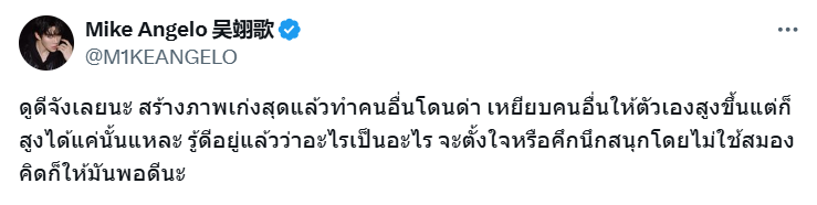 ดูดีจังเลยนะ สร้างภาพเก่งสุดแล้วทำคนอื่นโดนด่า เหยียบคนอื่นให้ตัวเองสูงขึ้นแต่ก็สูงได้แค่นั้นแหละ รู้ดีอยู่แล้วว่าอะไรเป็นอะไร จะตั้งใจหรือคึกนึกสนุกโดยไม่ใช้สมองคิดก็ให้มันพอดีนะ อีกทั้ง ยังได้โพสต์ต่ออีกว่า ”เดี๋ยวพรุ่งนี้มาเคลียร์ใน Tiktok นะ“ ท่ามกลางขาวเน็ตเข้ามาคอมเมนต์ สงสัยกันสนั่นว่า “ไมค์” ว่าใครกันนะ ยังไงก็ต้องรอหนุ่ม “ไมค์” เฉลยเองนะจ๊ะ