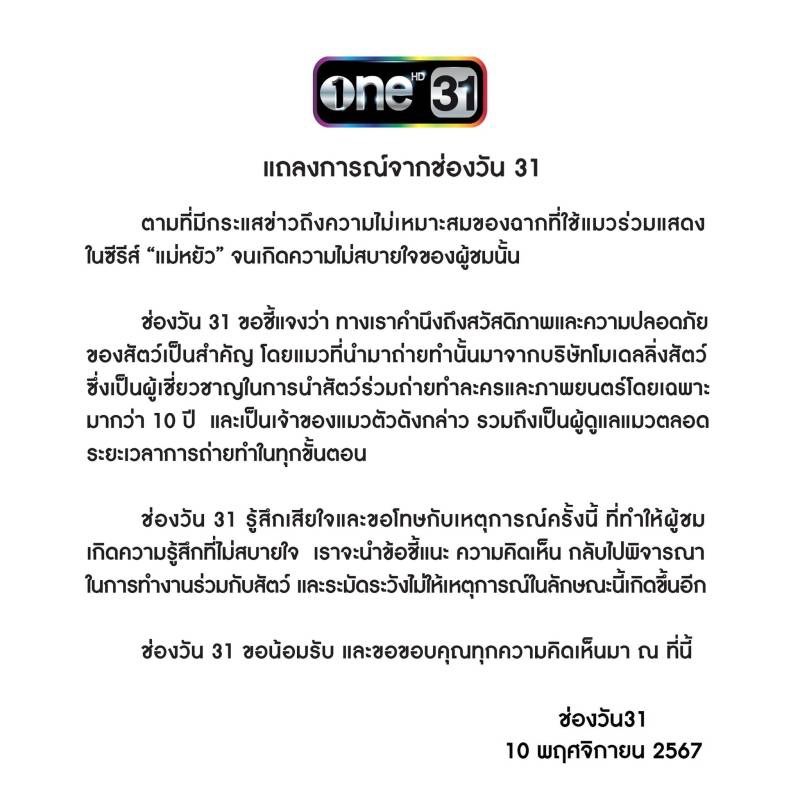 ล่าสุดทางด้าน “ช่องวัน” ได้ร่อนจดหมายประกาศชี้แจงว่า “แถลงการณ์จากช่องวัน 31 ตามที่มีกระเเสข่าวถึงความไม่เหมาะสมของฉากที่ใช้เเมวร่วมแสดงในซีรีส์ แม่หยัว จนเกิดความไม่สบายใจของผู้ชมนั้น ช่องวัน 31 ขอชี้เเจงว่า ทางเราคำนึงถึงสวัสดิภาพและความปลอดภัยของสัตว์เป็นสำคัญ