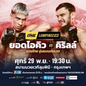 แง้มโปรแกรมเดือดส่งท้ายเดือน 11 ในศึก ONE ลุมพินี 89 วันศุกร์ที่ 29 พ.ย.นี้ โดย “ยอดไอคิว อ.พิมลศรี” มวยซ้ายใจเด็ด วัย 22 ปี จากบุรีรัมย์ เปิดหน้าแลก “คิริลล์ โคมูทอฟ” นักชกหมัดไว อายุ 26 ปี จากรัสเซีย ภายใต้กติกามวยไทย รุ่นแบนตัมเวต (135-145 ป.) ขึ้นป้ายคู่เอกของรายการ ถ่ายทอดสดจากสนามมวยเวทีลุมพินี (รามอินทรา) เริ่มคู่แรก 19.30 น.