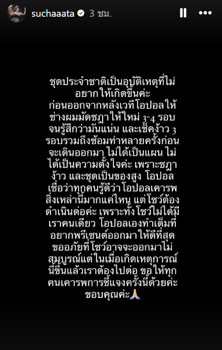 ล่าสุดทางด้าน “โอปอล” ได้ออกมาเคลื่อนไหวชี้แจงสาเหตุของเครื่องหัวชฎาหลุดลงในไอจีสตอรี่ว่า ”ชุดประจำชาติเป็นอุบัติเหตุที่ไม่อยากให้เกิดขึ้นค่ะ ก่อนออกจากหลังเวทีโอปอลให้ช่างผมมัดชฎาให้ใหม่ 3-4 รอบ จนรู้สึกว่ามันแน่น และเช็คง้าว 3 รอบรวมถึงซ้อมท่าหลายครั้งก่อนจะเดินออกมา ไม่ได้เป็นแผน ไม่ได้เป็นความตั้งใจค่ะ เพราะชฎา ง้าว และชุดเป็นของสูง โอปอลเชื่อว่าทุกคนรู้ดีว่าโอปอลเคารพสิ่งเหล่านี้มากแค่ไหน แต่โชว์ต้องดำเนินต่อค่ะ เพราะทั้งโชว์ไม่ได้มีเราคนเดียว โอปอลเองทำเต็มที่ อยากพรีเซนต์ออกมาให้ดีที่สุด ขออภัยที่โชว์อาจจะออกมาไม่สมบูรณ์แต่ในเมื่อเกิดเหตุการณ์นี้ขึ้นแล้วเราต้องไปต่อ ขอให้ทุกคนเคารพการชี้แจงครั้งนี้ด้วยค่ะ ขอบคุณค่ะ“ ท่ามกลางแฟนนางงามเข้ามาส่งกำลังใจให้สาว”โอปอล“ เป็นจำนวนมาก