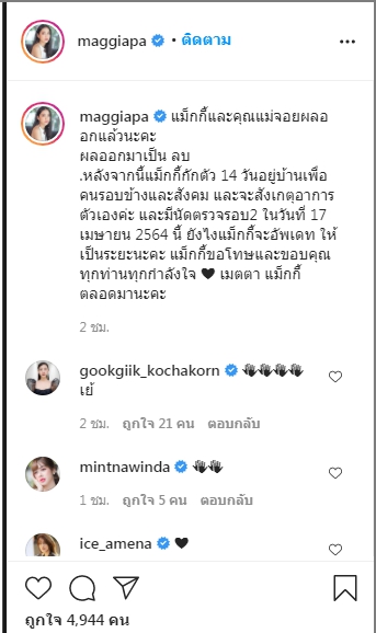 โดยสาวแม็กกี้ โพสต์โชว์ผลตจรวจ ลงในอินสตาแกรมส่วนตัว พร้อมแคปชั่นว่า ” แม็กกี้และคุณแม่จอยผลออกแล้วนะคะผลออกมาเป็น ลบ.หลังจากนี้แม็กกี้กักตัว 14 วันอยู่บ้านเพื่อคนรอบข้างและสังคม และจะสังเกตุอาการตัวเองค่ะ และมีนัดตรวจรอบ2 ในวันที่ 17 เมษายน 2564 นี้ ยังไงแม็กกี้จะอัพเดท ให้เป็นระยะนะคะ แม็กกี้ขอโทษและขอบคุณทุกท่านทุกกำลังใจ ❤️ เมตตา แม็กกี้ ตลอดมานะคะ”