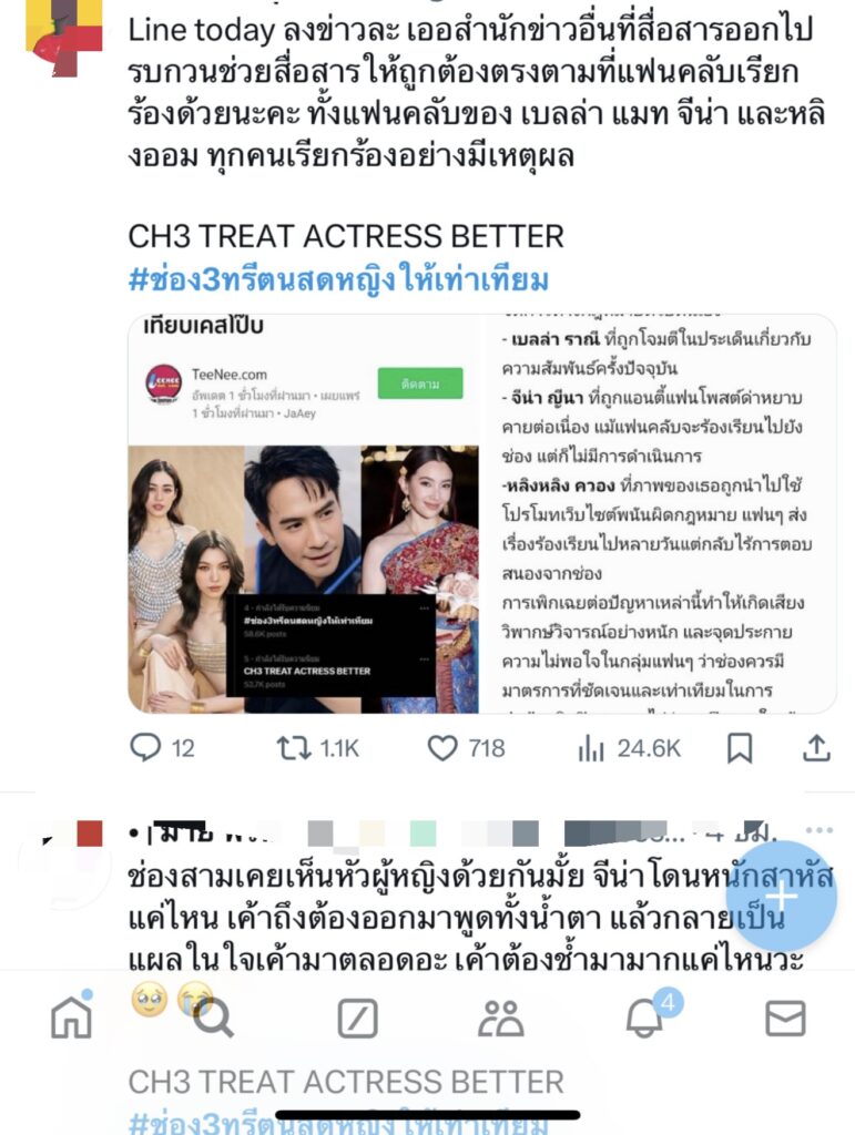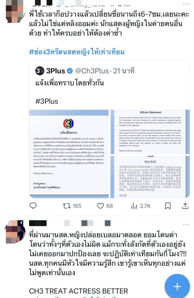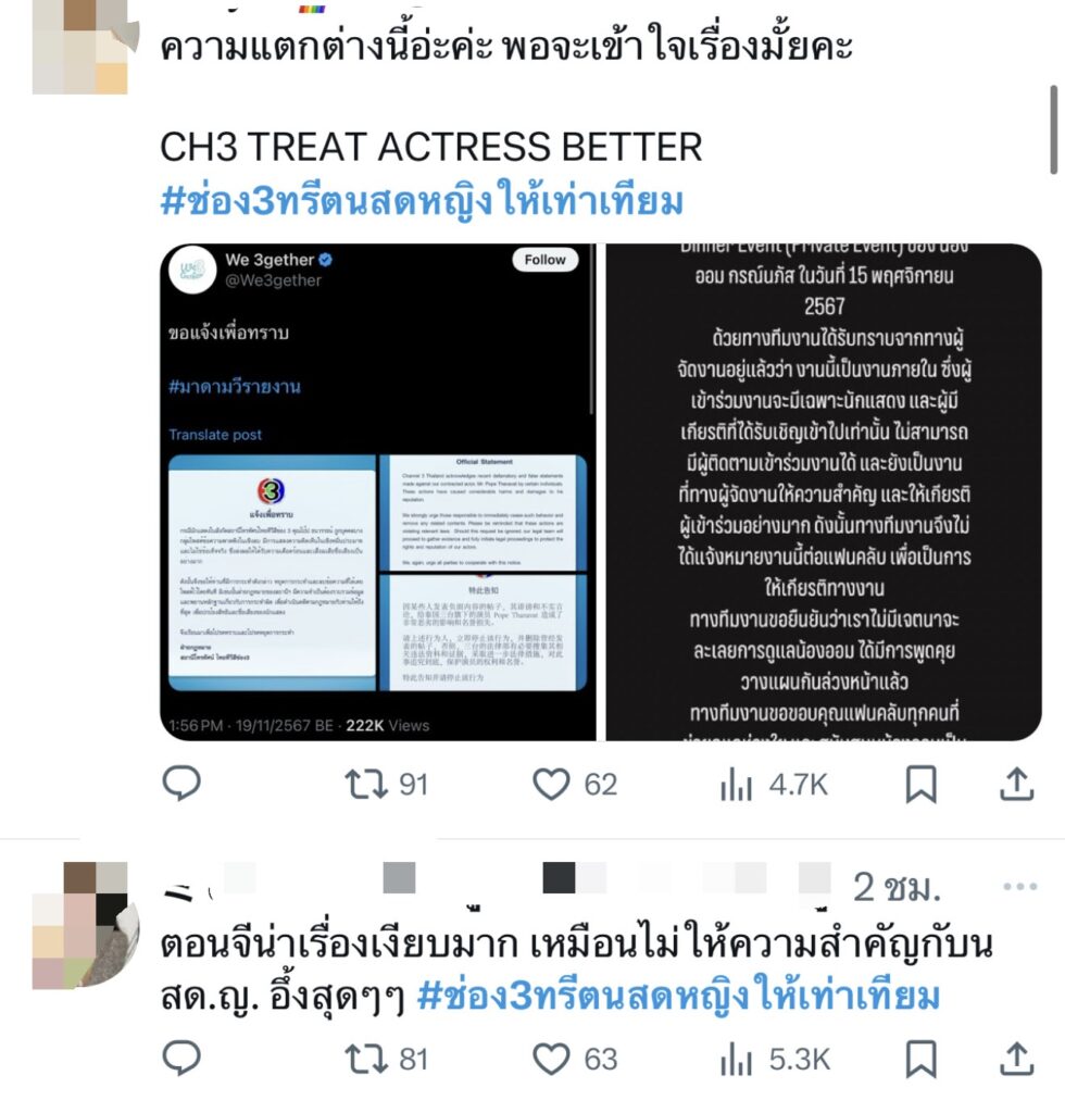 ล่าสุดทำเอาชาวเน็ตไม่พอใจต่างออกมาร่วมใจร่วมมือติด #ช่อง3ทรีตนสดหญิงให้เท่าเทียม ขึ้นเทรนด์ X อย่างรวดเร็ว เนื่องจากมองว่ามันไม่เท่าเทียม ถ้าจะปกป้องแค่นักแสดงชาย ทั้งที่นักแสดงหญิง ก็โดนหนักเหมือนกัน และต่างหยิบยกแคสของ “เบลล่า ราณี” – “หลิงหลิง คอง” – จีน่า ณีนา“ เป็นต้น“