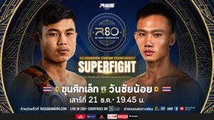 ศึกเฉลิมฉลองการก้าวเข้าสู่ปีที่ 80 ของเวทีราชดำเนินในวันที่ 21 ธ.ค. นี้ คู่สำคัญคือ RAJADAMNERN STADIUM CHAMPIONSHIP SUPERFIGHT ขุนศึกเล็ก บูมเด็กเซียน จะขึ้นชกป้องกันตำแหน่งแชมป์รุ่นแบนตัมเวทของเวทีราชดำเนิน กับ วันชัยน้อย ส.ท.เหี่ยวบางแสน เจ้าของเข็มขัดแชมป์รุ่นแบนตัมเวทของเวทีมวยช่อง 7 HD เพื่อพิสูจน์ว่าใครกันแน่ที่คือเบอร์หนึ่งของพิกัดแบนตัมเวทกัน