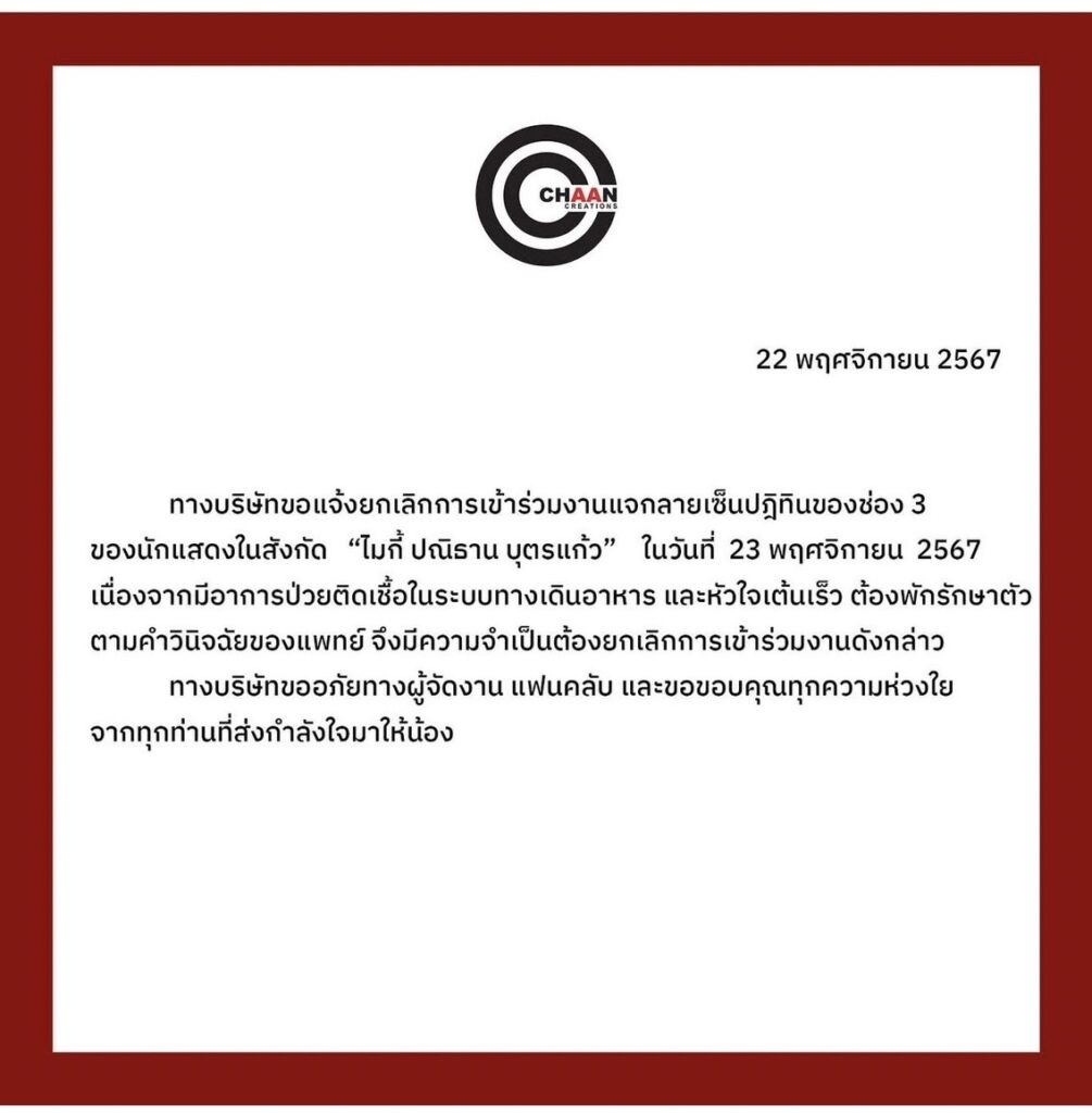 ทำเอาแฟนคลับแห่เป็นห่วง และ ส่งกำลังใจให้แบบรั่วๆ สำหรับนักแสดงหนุ่ม “ไมกี้ ปณิธาน” หลังจากติดเชื้อในระบบทางเดินอาหาร โดยทางต้นสังกัด ได้ร่อนจดหมายประกาศว่า “ทางบริษัทขอแจ้งยกเลิกการเข้าร่วมงานแจกลายเซ็นปฏิทินของช่อง 3 ของนักแสดงในสังกัด “ไมกี้ ปณิธาน บุตรแก้ว” ในวันที่ 23 พฤศจิกายน 2567 เนื่องจากมีอาการป่วยติดเชื้อในระบบทางเดินอาหาร และหัวใจเต้นเร็ว ต้องพักรักษาตัวตามคำวินิจฉัยของแพทย์ จึงมีความจำเป็นต้องยกเลิกการเข้าร่วมงานดังกล่าว ทางบริษัทขออภัยทางผู้จัดงาน แฟนคลับ และขอขอบคุณทุกความห่วงใยจากทุกท่านที่ส่งกำลังใจมาให้น้อง” ท่ามกลางแฟน ๆ เข้ามาส่งกำลังใจให้เป็นจำนวนมาก