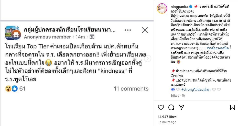 กลายเป็นประเด็นร้อนแรงบนโลกโซเซียลหลังมีเฟซบุ๊กท่านหนึ่งออกมาโพสต์ในกลุ่มผู้ปกครองโรงเรียนนานาชาติ ค่าเทอมปีละเกือบล้านดักตบกันกลางที่จอดรถในโรงเรียน จนเลือดตกยางออก เพิ่งย้ายมาเรียนเจออะไรแบบนี้ตกใจ อยากให้โรงเรียนมีมาตรการเชิญออกทั้งคู่ ไม่ใช่ตัวอย่างที่ดีของทั้งเด็ก ๆ และสังคม Kindness (ความใจดี) ที่โรงเรียนพูดไว้เลย ซึ่งทำให้คุณแม่อย่าง “หนิง ปณิตา” ถูกโยงว่าคือเธอหรือเปล่าที่เป็นผู้ปกครองดักตบกันกลางโรงเรียน