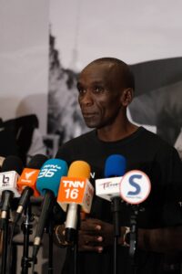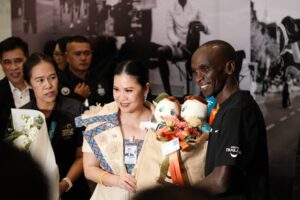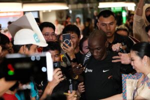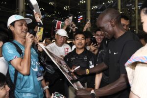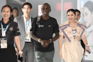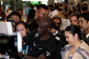 เมื่อวันที่ 27 พ.ย.67 ที่ผ่านมา เอเลียด คิปโชเก ตำนานนักวิ่งมาราธอนโลก เจ้าของสถิติวิ่งมาราธอนได้ต่ำกว่า 2 ชม. แชมป์โอลิมปิกเกมส์ 2 สมัย ชาวเคนยา พร้อมคณะ ได้เดินทางมาถึงประเทศไทย เป็นที่เรียบร้อยแล้ว เพื่อเข้าร่วมการแข่งขันวิ่งมาราธอนส่งเสริมการท่องเที่ยวระดับโลก ครั้งที่ 7 ประจำปี 2567 รายการ “อะเมซิ่ง ไทยแลนด์ มาราธอน แบงค็อก พรีเซ็นต์บาย โตโยต้า ครั้งที่ 7” หรือ “วิ่งผ่าเมือง” ชิงถ้วยพระราชทานพระบาทสมเด็จพระเจ้าอยู่หัว สมเด็จพระนางเจ้าฯ พระบรมราชินี และสมเด็จพระเจ้าลูกเธอ เจ้าฟ้าพัชรกิติยาภาฯ ชิงเงินรางวัลรวม 2,440,500 บาท โดยมี นางสาวฐาปนีย์ เกียรติไพบูลย์ ผู้ว่าการการท่องเที่ยวแห่งประเทศไทย (ททท.) และนายกอบเกียรติ แสงวนิชย์ ผู้อำนวยการจัดการแข่งขัน มาร่วมต้อนรับ พร้อมสื่อมวลชนและแฟนคลับนักวิ่งมาต้อนรับที่ท่าอากาศยานสุวรรณภูมิอย่างคับคั่ง