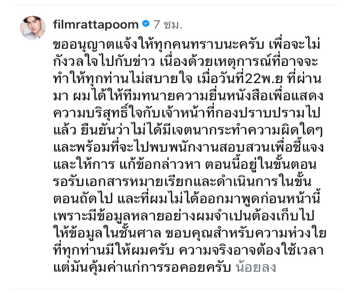 “ขออนุญาตแจ้งให้ทุกคนทราบนะครับ เพื่อจะไม่กังวลใจไปกับข่าว เนื่องด้วยเหตุการณ์ที่อาจจะทำให้ทุกท่านไม่สบายใจ เมื่อวันที่22พ.ย ที่ผ่านมา ผมได้ให้ทีมทนายความยื่นหนังสือเพื่อแสดงความบริสุทธิ์ใจกับเจ้าหน้าที่กองปราบปรามไปแล้ว ยืนยันว่าไม่ได้มีเจตนากระทำความผิดใดๆและพร้อมที่จะไปพบพนักงานสอบสวนเพื่อชี้แจงและให้การ แก้ข้อกล่าวหา