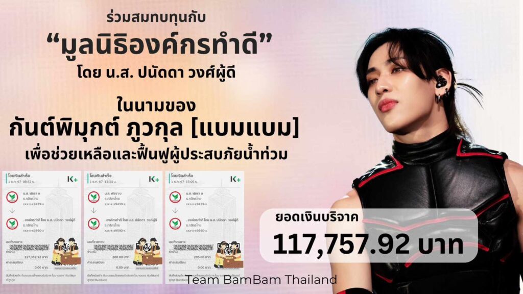 “แบมแบม GOT7” พร้อมทีม บริจาคเงินช่วยเหลือผู้ประสบภัยน้ำท่วมภาคใต้ ผ่านมูลนิธิ “บุ๋ม ปนัดดา” แฟนคลับแห่ร่วมอนุโมธนาบุญ