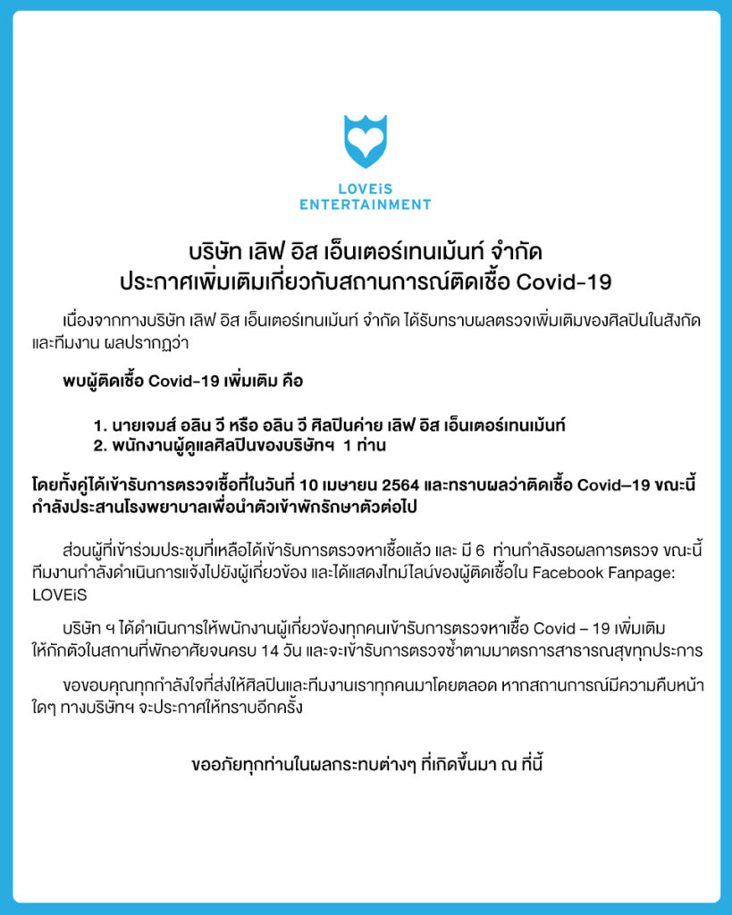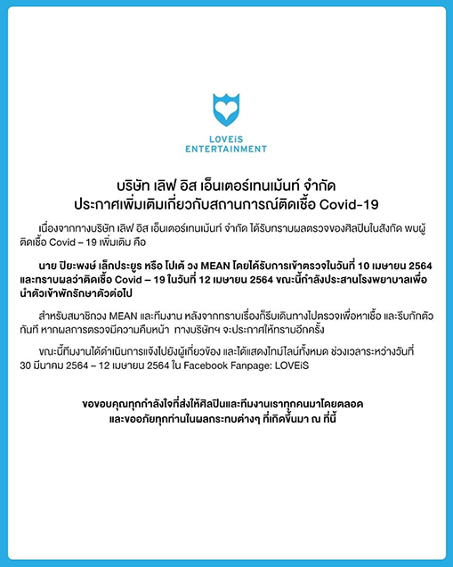 ค่ายเพลงเลิฟอีสสะเทือน หลังจากที่ นนท์ ธนนท์ จำเริญ ประกาศติดเชื้อโควิด-19 ไปเมื่อวานนี้ หลังจากเข้าประชุมที่บริษัท และมีผู้ติดเชื้อเข้าร่วมประชุมในครั้งนี้ด้วย ล่าสุดวันนี้ บริษัทเลิฟอีส ได้ออกประกาศเพิ่มเติม ว่ามีผู้ติดเชื้อเพิ่มอีก 3 คน เป็นศิลปิน 2 คน คือ โปเต้ นักร้องนำ วง MEAN แจ้งไทม์ไลน์เดินทางหลายที่ ส่วนอีกคนคือ นักร้องหนุ่ม เจมส์ อลิน วี หรือ อลิน วี แจ้งไทม์ไลน์ไม่รู้ติดจากที่ไหน และ พนักงานของบริษัทอีก 1 คน โดยมีรายละเอียดดังต่อไปนี้