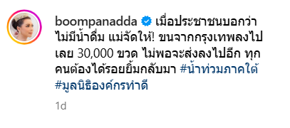 โดยล่าสุด “บุ๋ม ปนัดดา” ได้บริจาคน้ำดื่มจำนวน 30,000 ขวดให้กับผู้ประสบภัยน้ำท่วมในภาคใต้ พร้อมกับเผยผ่านในแคปชั่นอินสตราแกรมว่า “เมื่อประชาชนบอกว่าไม่มีน้ำดื่ม แม่จัดให้! ขนจากกรุงเทพลงไปเลย 30,000 ขวด ไม่พอจะส่งลงไปอีก ทุกคนต้องได้รอยยิ้มกลับมา #น้ำท่วมภาคใต้ #มูลนิธิองค์กรทำดี”