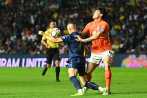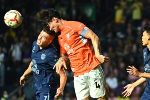 นาทีที่ 64 กิลเยร์เม บิสโซลี ได้บอลหน้ากรอบเขตโทษหมุนหลอกผู้เล่นทีมเยือนจ่ายเข้าเขตโทษด้านขวาให้ นฤบดินทร์ วีรวัฒโนดม วิ่งเข้ามากดด้วยเข้าไปที่เสาแรก กัมพล ปฐมอรรฆย์กุล ยืนอยู่ใกล้ ๆ ปัดบอลออกหลังไปได้ฉิวเฉียด