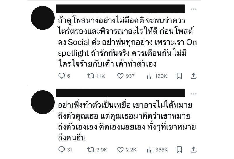 ซึ่งหลังจากนั้นก็เกิดเสียงแตกกันมากมายบนเอ็กซ์ บางส่วนก็บอกว่า “อย่าเพิ่งทำตัวเป็นเหยื่อ เขาอาจไม่ได้หมายถึงตัวคุณเธอ แต่คุณเธอมาคิดว่าเขาหมายถึงตัวเองเอง คิดเองนอยเอง ทั้งๆที่เขาหมายถึงคนอื่น“บางส่วนก็ออกมาปกป้อง ”ใหม่ ดาวิกา“ ว่า เอาตรงๆ ต้นเรื่องจริงๆ เขาจะแซะคุณใหม่นั่นแหละ แค่อ่านก็รู้แล้ว แต่แค่มีหลายไม่รู้ เฉยๆ”