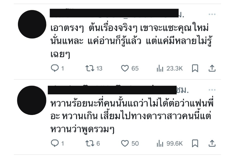 ซึ่งหลังจากนั้นก็เกิดเสียงแตกกันมากมายบนเอ็กซ์ บางส่วนก็บอกว่า “อย่าเพิ่งทำตัวเป็นเหยื่อ เขาอาจไม่ได้หมายถึงตัวคุณเธอ แต่คุณเธอมาคิดว่าเขาหมายถึงตัวเองเอง คิดเองนอยเอง ทั้งๆที่เขาหมายถึงคนอื่น“บางส่วนก็ออกมาปกป้อง ”ใหม่ ดาวิกา“ ว่า เอาตรงๆ ต้นเรื่องจริงๆ เขาจะแซะคุณใหม่นั่นแหละ แค่อ่านก็รู้แล้ว แต่แค่มีหลายไม่รู้ เฉยๆ”