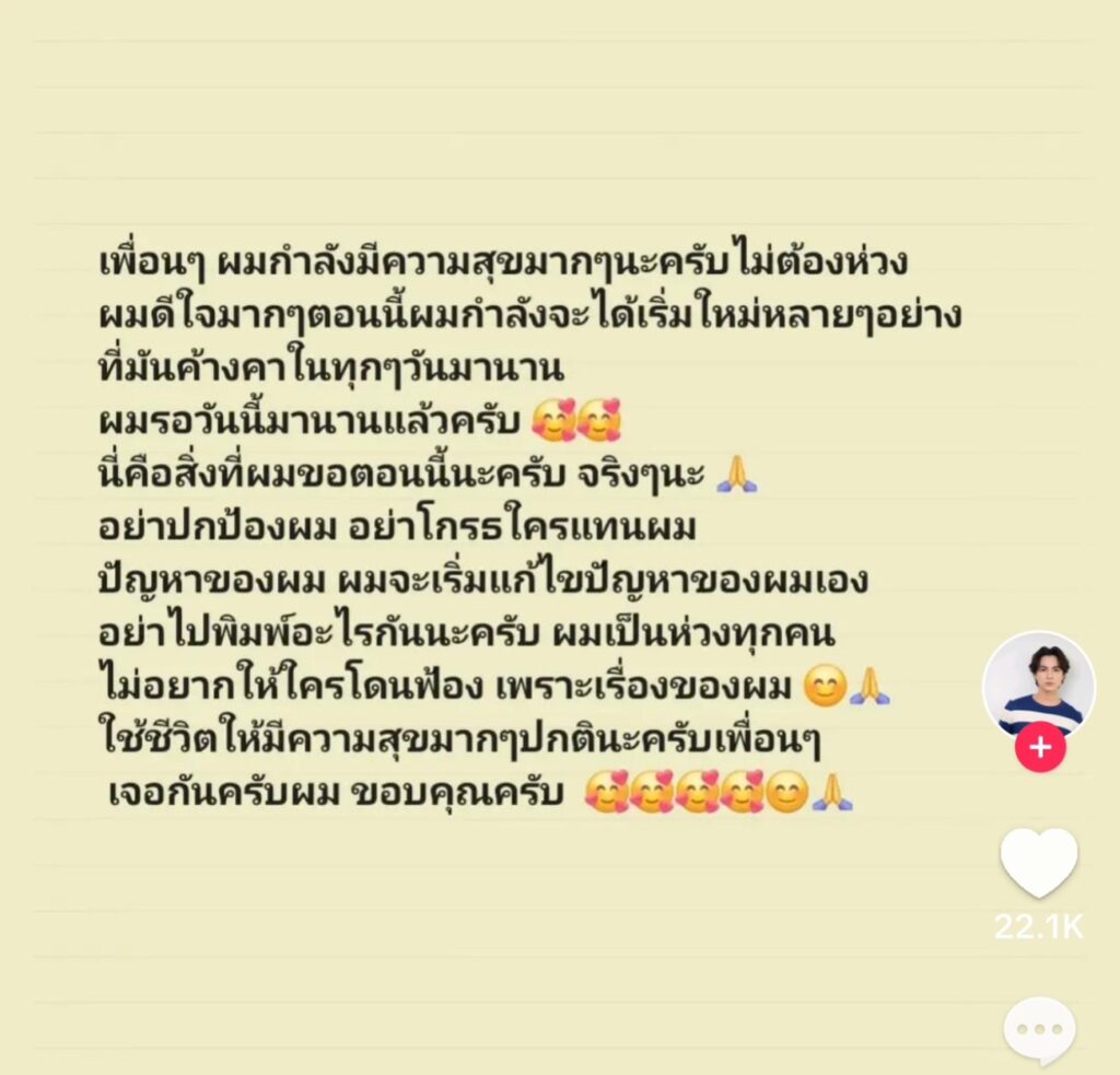 อย่าไปพิมพ์อะไรกันนะครับ ผมเป็นห่วงทุกคน ไม่อยากให้ใครโดนฟ้อง เพราะเรื่องของผมใช้ชีวิตให้มีความสุขมากๆปกตินะครับเพื่อนๆ เจอกันครับผม ขอบคุณครับ”