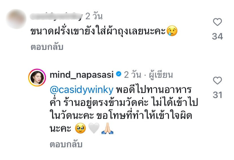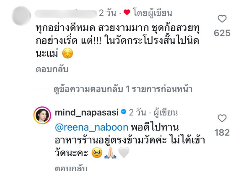 งานนี้ทำเอา “มายด์ ณภศศิ” รีบออกมาตอบคอมเมนต์ว่า “พอดีไปทานอาหารร้านอยู่ตรงข้ามวัดค่ะ ไม่ได้เข้าวัดนะคะ ขอโทษที่ทำให้เข้าใจผิดนะคะ”