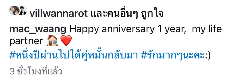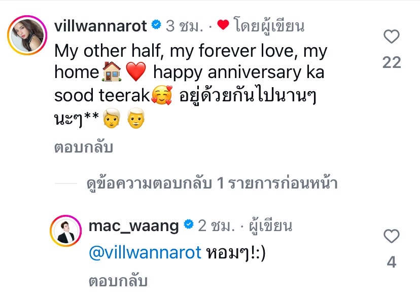 ด้าน “วิว วรรณรท” ก็ได้มาคอนเมนต์ตอบกลับแฟนหนุ่มว่า “My other half, my forever love, my home happy anniversary ka sood teerak.อยู่ด้วยกันไปนานๆ นะๆ” ทาง “แม็ค” ก็ได้มาตอบกลับแฟนสาวอีกด้วยว่า “หอมๆ!:)” งานนี้ทำเอาเพื่อน ๆ ในวงการบันเทิงและชาวเน็ตต่างพากันเข้ากดไลค์พร้อมคอมเมนต์แซวทั้งคู่กันเพียบ