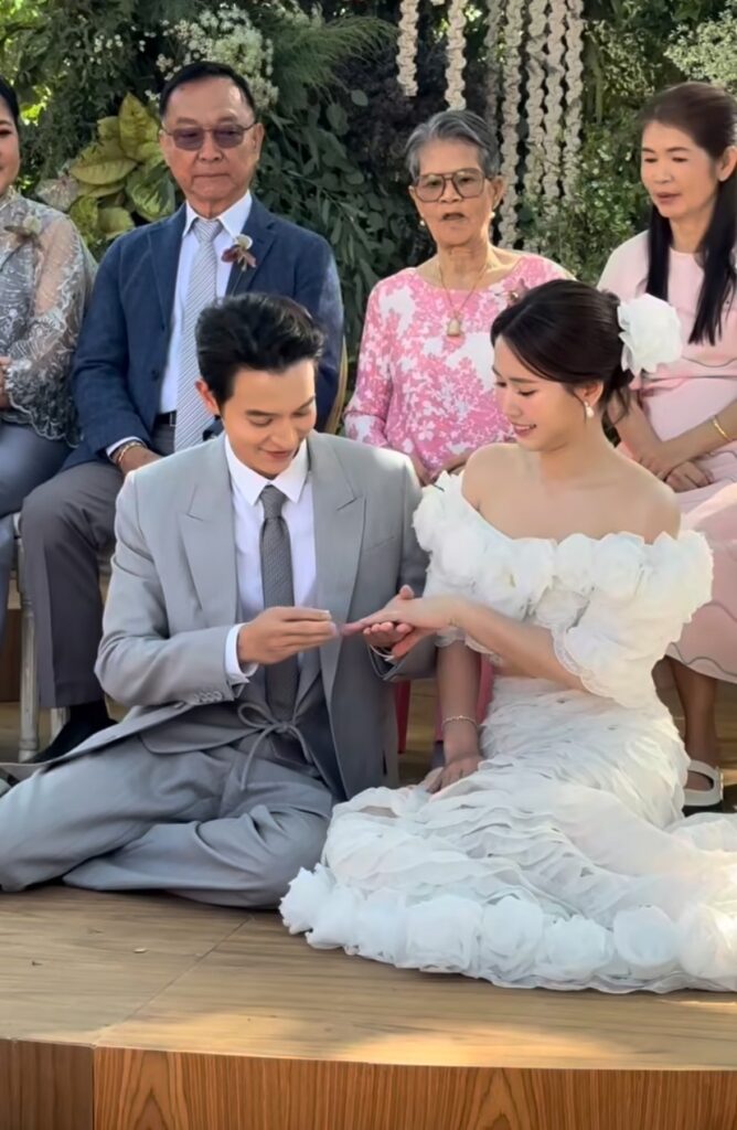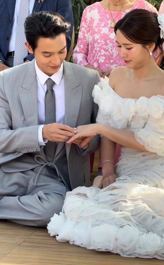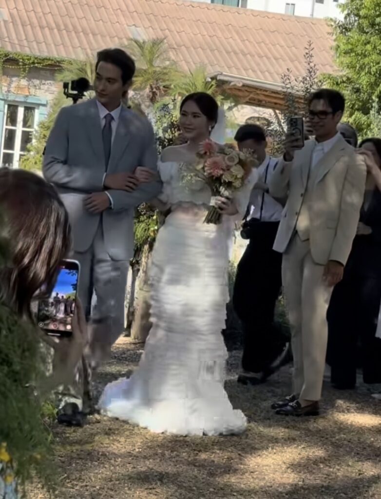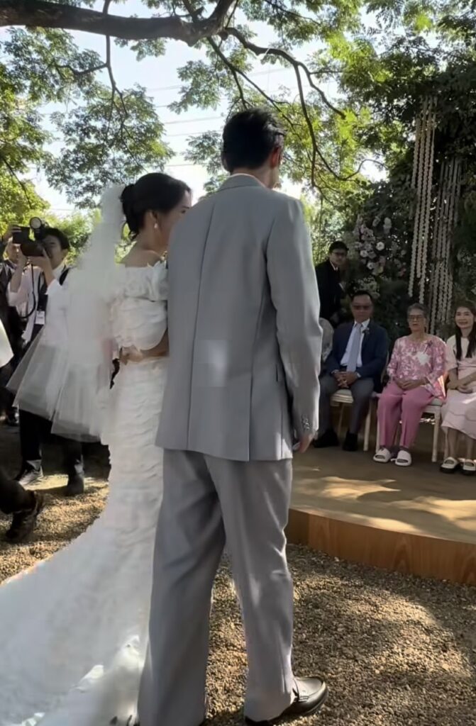 โดยเจ้าบ่าว เจ้าสาว มาในชุดที่เรียบหรู ดูแพง สวยหล่อ ออร่าสุดๆ ท่ามกลางเสียงตะโกนว่า สวยมาก หล่อมาก กึกก้องภายในงาน