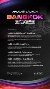 กิจกรรม MotoGP™ season launch วันที่ 9 กพ. 2568 ที่ One Bangkok กรุงเทพ จะถ่ายทอดสดไปทั่วโลก ส่งมอบประสบการณ์สุดเอ็กซ์คลูซีฟให้กับแฟนความเร็วมากมาย อาทิ การจัดแสดงรถแข่งให้แฟนความเร็วได้ชมอย่างใกล้ชิดตลอดทั้งวัน