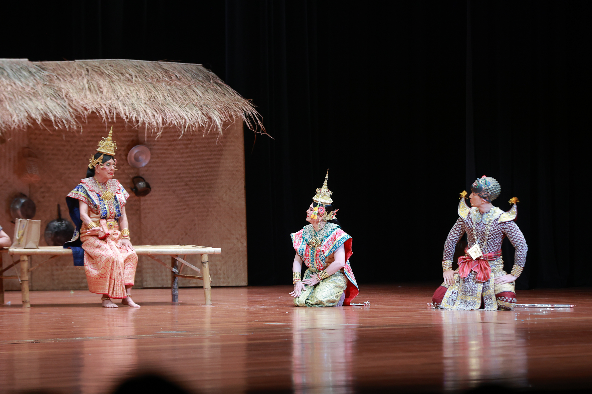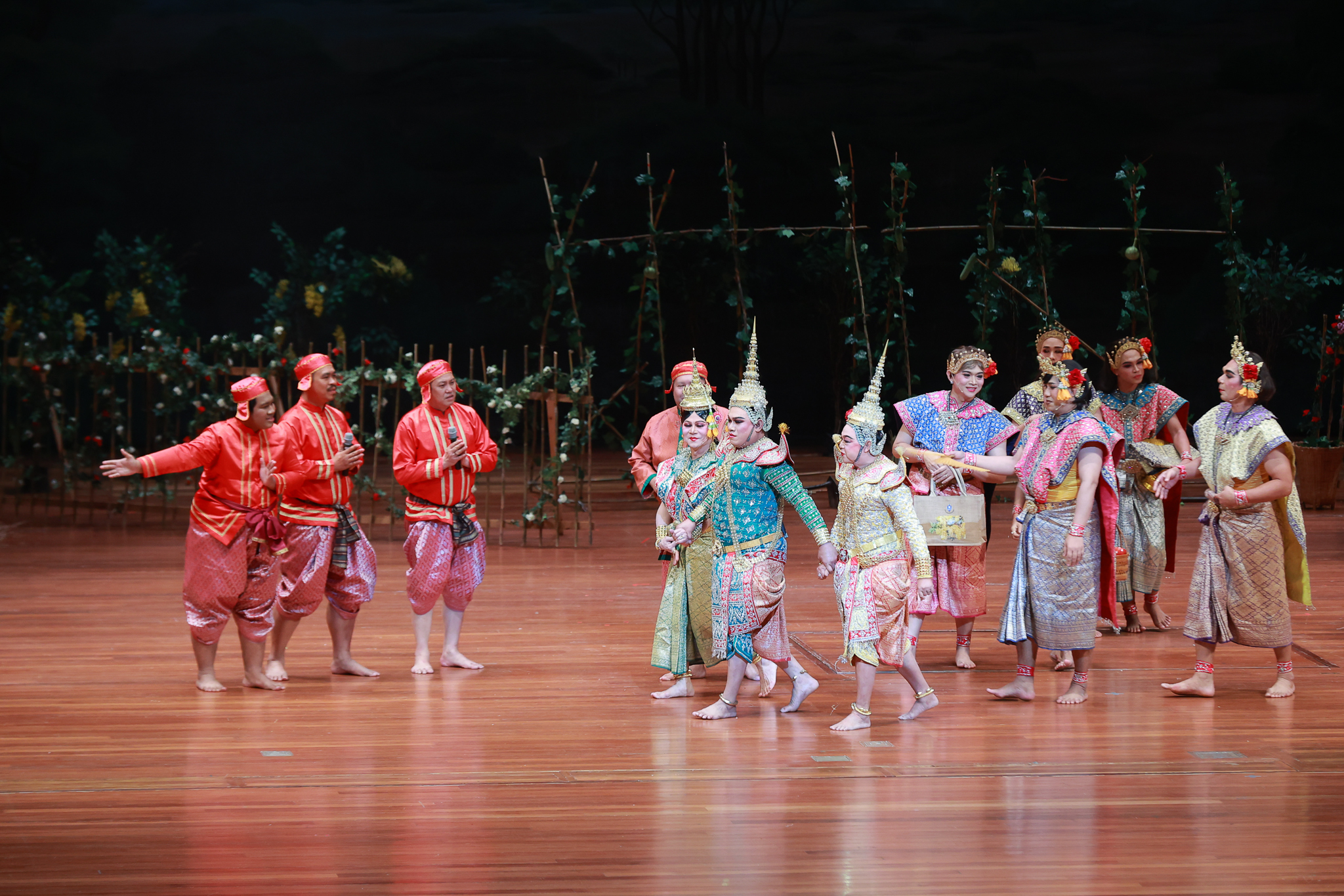 ช่วงแรกเป็นรำถวายพระพร “ ๗๒ เกริกไกร เทิดไท้เหนือเกล้า เจ้าไผทสยาม “ และการแสดงละครนอก เรื่องสังข์ทอง ตอน มณฑาลงกระท่อม ซึ่งละครนอกจะใช้นักแสดงเป็นผู้ชายล้วน โดยมีศิลปินแห่งชาติร่วมแสดง จำนวน 3 ท่านร่วมแสดงและขับร้องเพลงคือ พ่ออี๊ด สุประวัติ ปัทมสูต ศิลปินแห่งชาติ สาขาศิลปะการแสดง ประจำปี พ.ศ. 2553 แสดงเป็นนางมณฑา นายไพฑูรย์ เข้มแข็ง ศิลปินแห่งชาติ ศิลปินแห่งชาติ สาขาศิลปะการแสดง (นาฏศิลป์ไทย – โขน ละคร) ประจำปีพุทธศักราช 2564 แสดงเป็นพระสังข์ ดร.ศุภชัย จันทร์สุวรรณ์ ศิลปินแห่งชาติ สาขาศิลปะการแสดง (นาฏศิลป์) ประจำปีพ.ศ. 2548 แสดงเป็นนางรจนา พร้อมศิลปินจากกรมศิลปากร ศิลปินรับเชิญ และนักแสดงจากชมรมนาฏศิลป์และดนตรีไทย ในมูลนิธืสมาคมสตรีอุดมศึกษา ฯ
