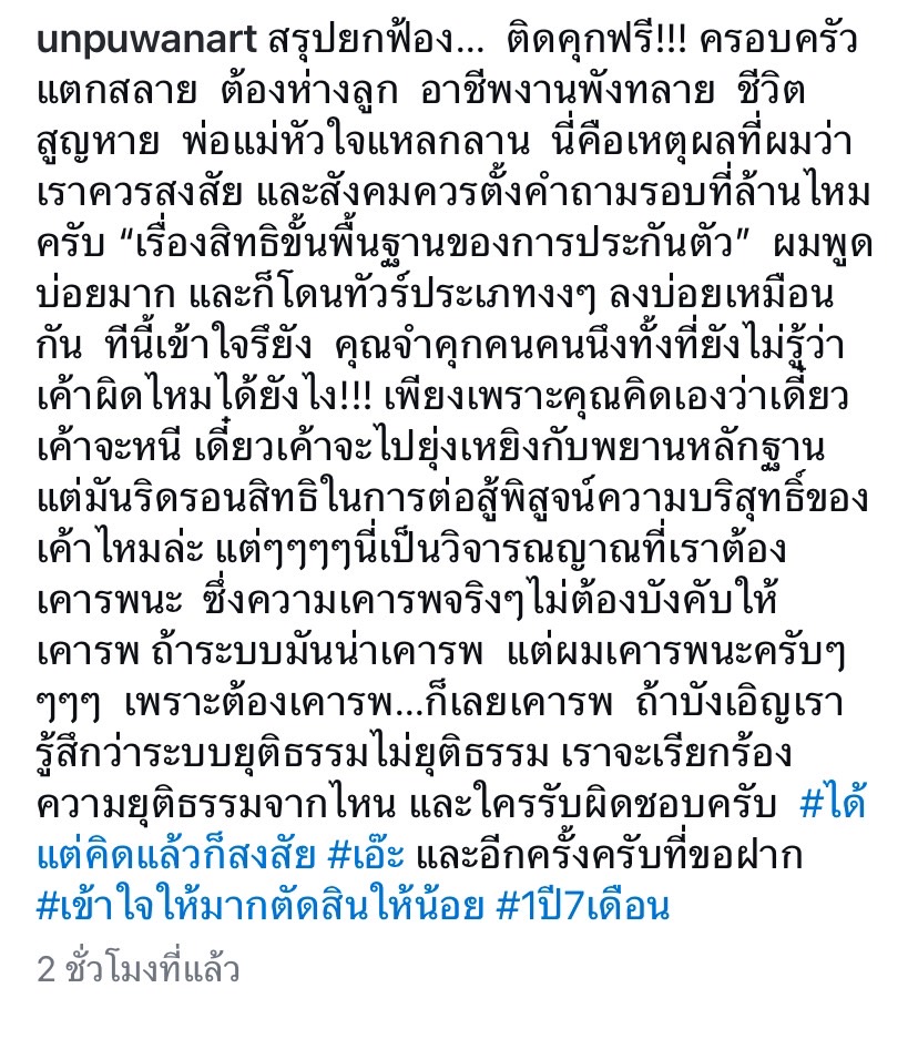 “สรุปยกฟ้อง… ติดคุกฟรี!!! ครอบครัวแตกสลาย ต้องห่างลูก อาชีพงานพังทลาย ชีวิตสูญหาย พ่อแม่หัวใจแหลกลาน นี่คือเหตุผลที่ผมว่าเราควรสงสัย และสังคมควรตั้งคำถามรอบที่ล้านไหมครับ “เรื่องสิทธิขั้นพื้นฐานของการประกันตัว” ผมพูดบ่อยมาก และก็โดนทัวร์ประเภทงงๆ ลงบ่อยเหมือนกัน ทีนี้เข้าใจรึยัง คุณจำคุกคนคนนึงทั้งที่ยังไม่รู้ว่าเค้าผิดไหมได้ยังไง!!! เพียงเพราะคุณคิดเองว่าเดี๋ยวเค้าจะหนี เดี๋ยวเค้าจะไปยุ่งเหยิงกับพยานหลักฐาน แต่มันริดรอนสิทธิในการต่อสู้พิสูจน์ความบริสุทธิ์ของเค้าไหมล่ะ แต่ๆๆๆๆนี่เป็นวิจารณญาณที่เราต้องเคารพนะ ซึ่งความเคารพจริงๆไม่ต้องบังคับให้เคารพ ถ้าระบบมันน่าเคารพ แต่ผมเคารพนะครับๆๆๆๆ เพราะต้องเคารพ…ก็เลยเคารพ ถ้าบังเอิญเรารู้สึกว่าระบบยุติธรรมไม่ยุติธรรม เราจะเรียกร้องความยุติธรรมจากไหน และใครรับผิดชอบครับ #ได้แต่คิดแล้วก็สงสัย #เอ๊ะ และอีกครั้งครับที่ขอฝาก #เข้าใจให้มากตัดสินให้น้อย #1ปี7เดือน”
