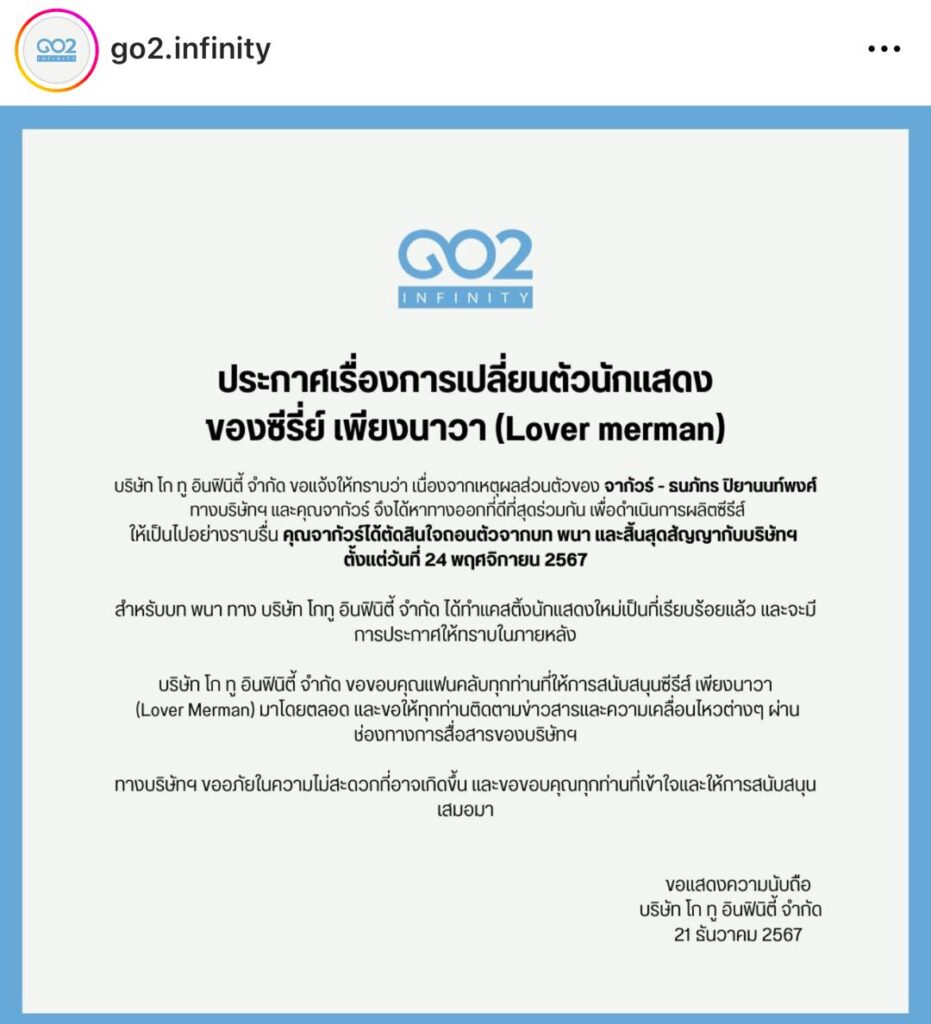 ปิดท้ายกันที่นักแสดงหนุ่ม “จากัวร์ ธนภัทร” ที่ทำเอาแฟนคลับช็อคไม่น้อยเมื่อทางค่ายได้ออกมาประกาศ เปลี่ยนตัวบท “พนา” ในซีรี่ย์เพียงนาวา (Lover merman) โดยแจ้งว่าเนื่องจากเหตุผลส่วนตัวของ “จากัวร์  ธนภัทร ปิยานนท์พงค์” ทางบริษัทฯ และคุณจากัวร์ จึงได้หาทางออกที่ดีที่สุดร่วมกัน เพื่อดำเนินการผลิตซีซีรี่ส์ให้เป็นไปอย่างราบรื่น คุณจาก้วร์ได้ตัดสินใจถอนตัวจากบท “พนา” และสิ้นสุดสัญญากับบริษัทฯ ตั้งแต่วันที่ 24 พฤศจิกายน 2567“