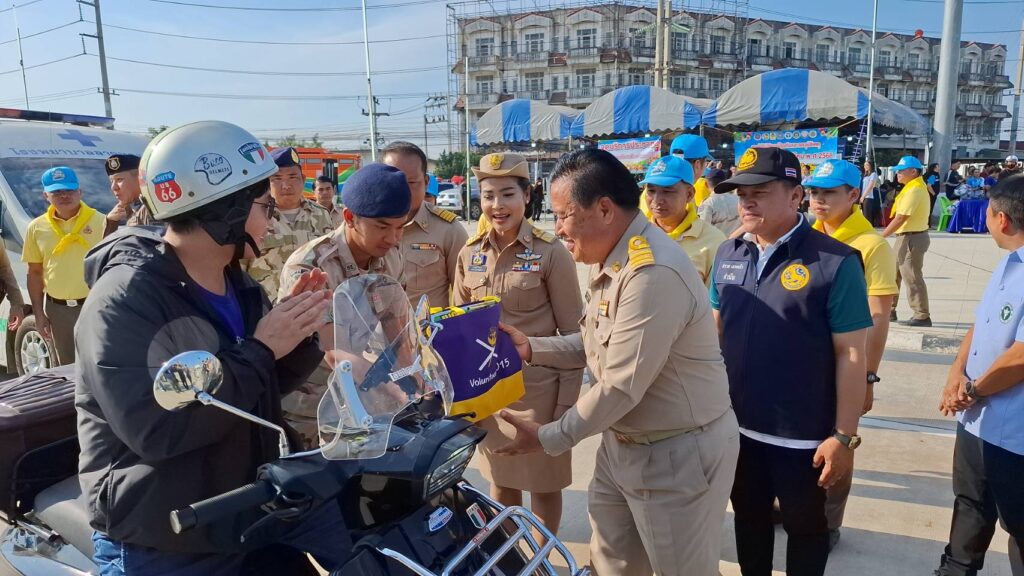 ปทุมธานี ลาดหลุมแก้วแจกหมวกกันน็อคฟรีรณรงค์กลับบ้านปลอดภัย 10 วันอันตรายเทศกาลปีใหม่