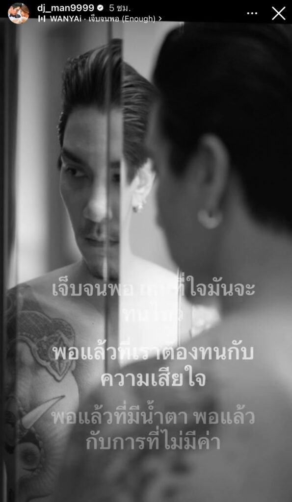 แต่ล่าสุดทำเอาชาวเน็ตเอ๊ะแห่สงสัยว่าเกิดอะไรขึ้น เมื่อทางด้าน “ดีเจแมน’ได้โพสต์ภสพตัวเองลงในไอจีสตอรี่ พร้อมกับเพลงเศร้าประกอบ งานนี้ชาวเน็ตก็แห่คาดเดาไปต่างๆนาๆ แต่ถึงอย่างไรก็ต้องรอฟังจากเจ้าตัวว่าเกิดอะไรขึ้นกันแน่