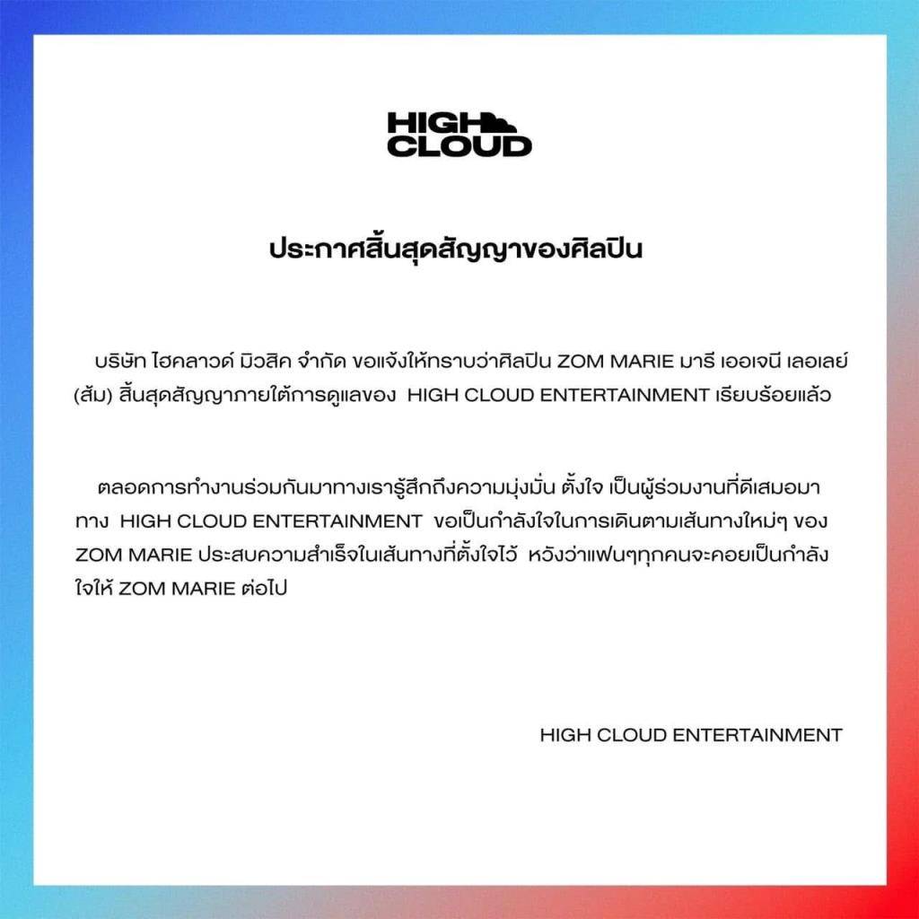 โดยล่าสุดทางด้าน “ส้ม มารี“ หนึ่งในศิลปิน ที่สิ้นสุดการเป็นศิลปินในค่าย ก็ได้ออกมาโพสต์ภาพจดหมายที่เขียนว่า “บริษัท ไฮคลาวด์ มิวสิค จำกัด ขอแจ้งให้ทราบว่าศิลปิน ZOM MARIE มารี เออเจนี เลอเลย์ (สัม) สิ้นสุดสัญญาภายใต้การดูแลของ HIGH CLOUD ENTERTAINMENT เรียบร้อยแล้วตลอดการทำงานร่วมกันมาทางเรารู้สึกถึงความมุ่งมั่น ตั้งใจ เป็นผู้ร่วมงานที่ดีเสมอมา