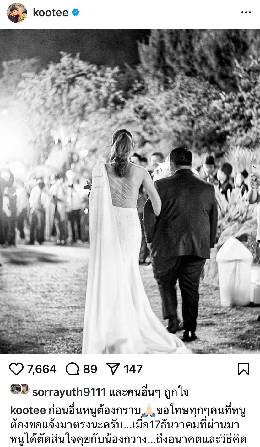 หนูขอขอบคุณผู้ใหญ่ทั้ง2ฝ่ายที่พยายามทำให้รักของเรา2คนไปกันต่อได้ แต่ชีวิตคู่มันเป็นเรื่องคน2คนจริงๆครับ…หนูขอโทษอาต๋อย(ซึ่งเปรียบเหมือนพ่อคนที่2ของหนู)หนูขอโทษพี่ยุทธที่หนูทำให้พี่ผิดหวังและกราบขอโทษผู้ใหญ่ของทางกวาง ทั้งโกน้อง ทั้งแม่ พี่ชายกวางอีก5คน อาเจ็กอาซิ่มและญาติของกวางทุกๆคน…ขอบคุณที่รักและเมตตาหนูมาโดยตลอด12ปี ก่อนหน้านี้หนูพยายามทำให้มันดีที่สุดเพราะไม่อยากให้ทุกๆต้องผิดหวังและเสียใจกับคู่ของหนูและกวางครับ…หนูยังรักและเคารพทุกๆท่านเหมือนเดิม🙏🏻เพียงแต่วันนี้ด้วยเหตุผลของเรา2คนเดินร่วมทางกันต่อไม่ได้…มันผิดที่หนูคนเดียวครับ เพราะนี่คือการตัดสินใจของหนูเองตั้งแต่ต้นครับ