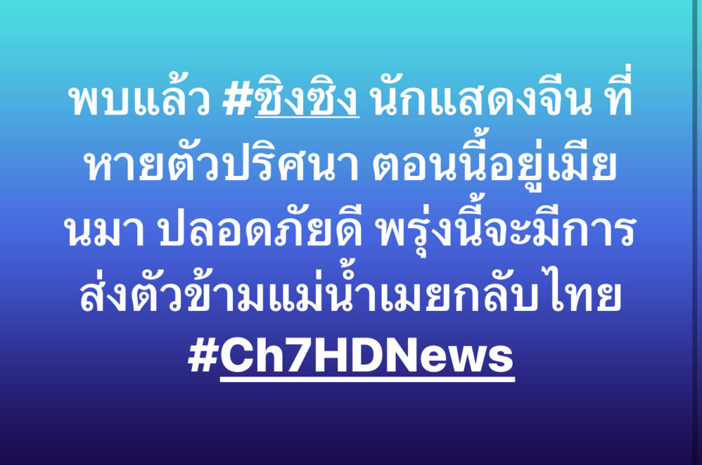 ล่าสุดพบตัวของ ”ซิงซิง“ โดย ทางเพจ Ch7HD News ได้รายงานระบุว่า พบแล้ว #ซิงซิง นักแสดงจีน ที่หายตัวปริศนา ตอนนี้อยู่เมียนมา ปลอดภัยดี พรุ่งนี้จะมีการส่งตัวข้ามแม่น้ำเมยกลับไทย #Ch7HDNews