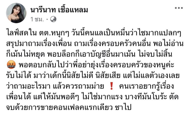 “ไลฟ์สดใน ตต.หนุกๆ วันนี้คนแลเป็นหมื่นว่าไซมากแปลกๆ สรุปมาถามเรื่องเพื่อน ถามเรื่องครอบครัวคนอื่น พอไม่อ่านก็เม้นไม่หยุด พอบล็อกก็เอาบัญชีอื่นมาเม้น ไม่จบไม่สิ้น 🤬 พอตอบกลับไปว่าพี่อย่ายุ่งเรื่องครอบครัวของหนูค่ะ รับไม่ได้ มาว่าเด้กนี้นิสัยไม่ดี นิสัยเสีย แต่ไม่แลตัวเองเลยว่าถามอะไรมา แล้วควรถามม่าย ❗️ คนเราอยากรู้เรื่องเพื่อนได้ แต่ให้มันพอดีๆ ไม่ใช่มากแรง บางทีมันโบร้ะ ตัดจบด้วยการขายคอนเฟลคแรกเดียว ซาไป”